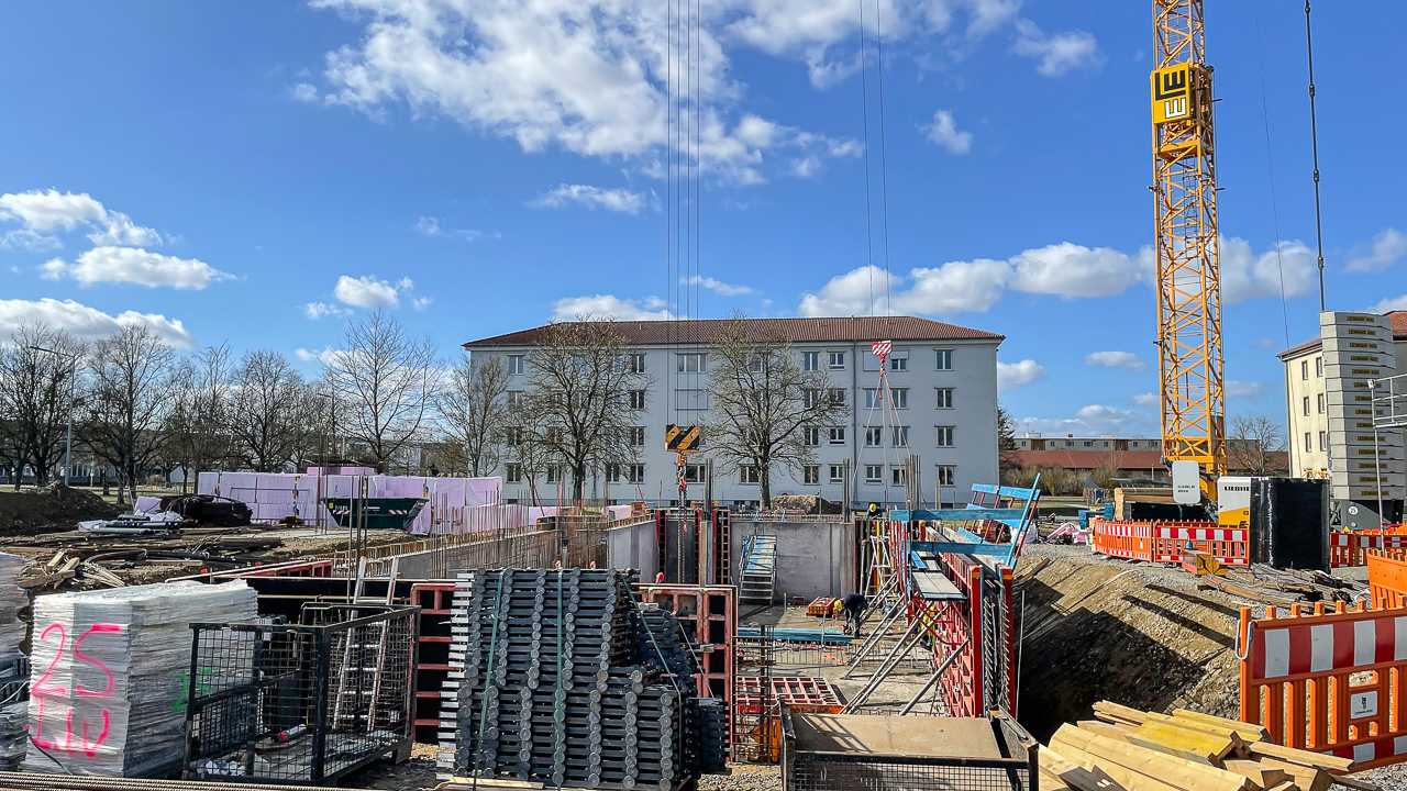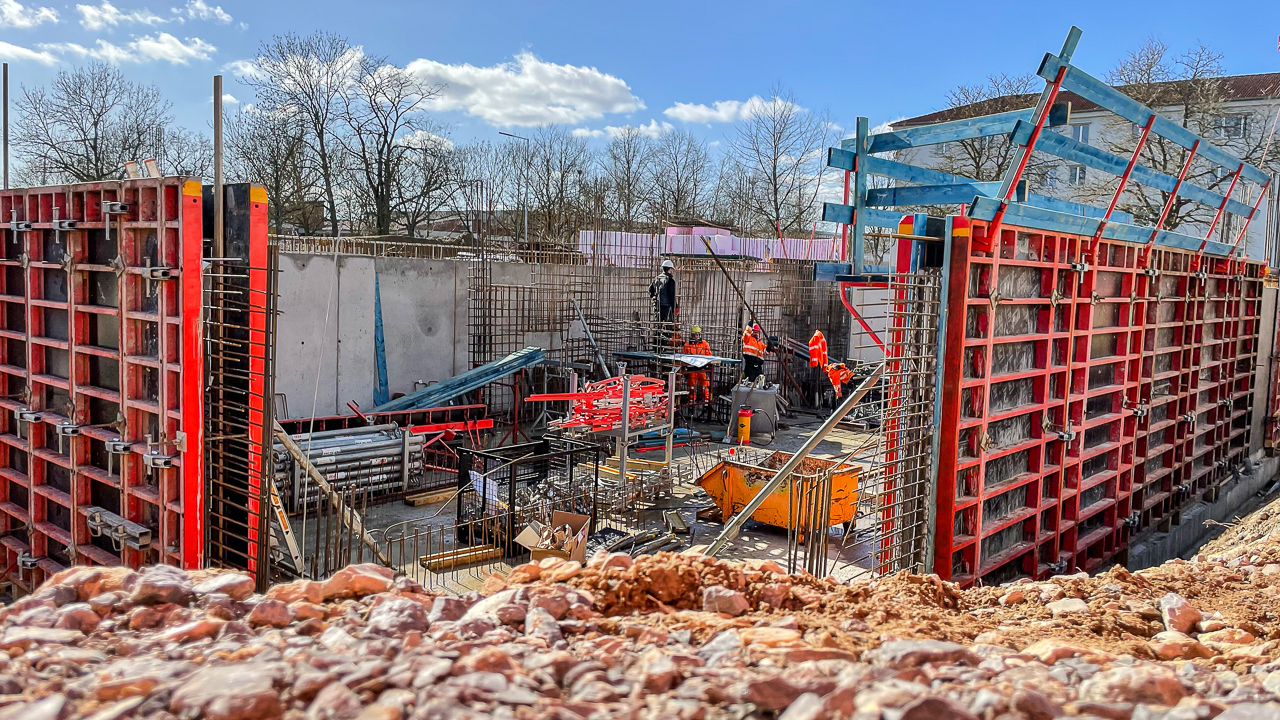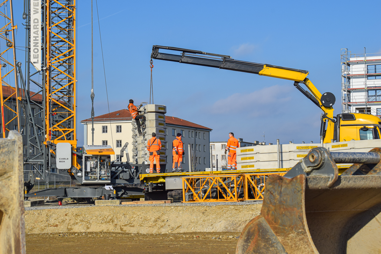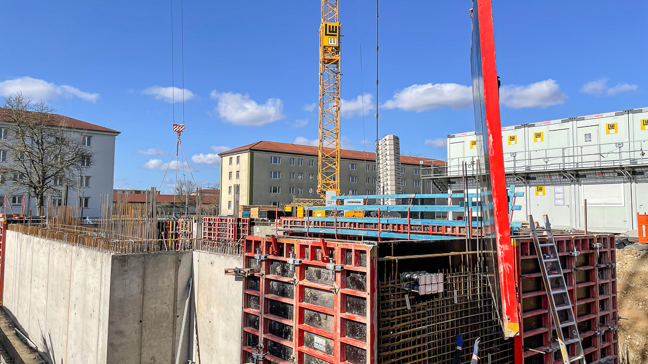 Die Schalungselemente für die angehenden Bauteile des Untergeschosses werden angebracht. Die Schalungstafel wird mit dem Baukran an die richtige Position bewegt. Anschließend werden die Elemente miteinander verbunden und für die Betonage vorbereitet - die Außenwand wird mit Beton ausgegossen. Der zweite Kran hilft das Tempo auf der Baustelle voranzutreiben.