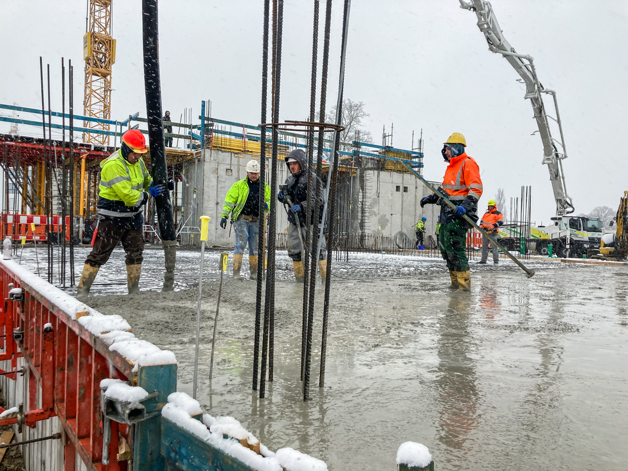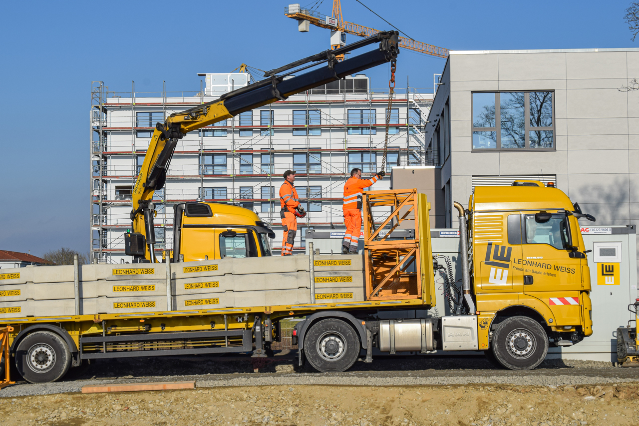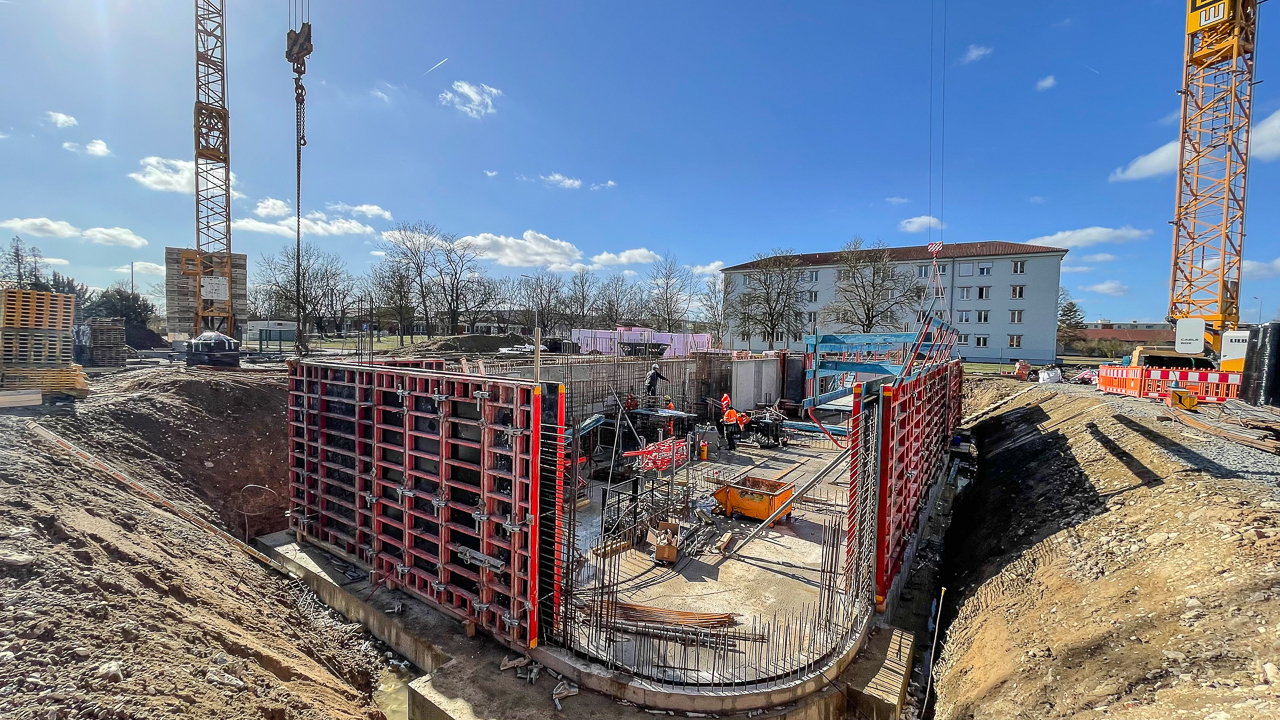 Die Schalungselemente für die angehenden Bauteile des Untergeschosses werden angebracht. Die Schalungstafel wird mit dem Baukran an die richtige Position bewegt. Anschließend werden die Elemente miteinander verbunden und für die Betonage vorbereitet - die Außenwand wird mit Beton ausgegossen. Der zweite Kran hilft das Tempo auf der Baustelle voranzutreiben.