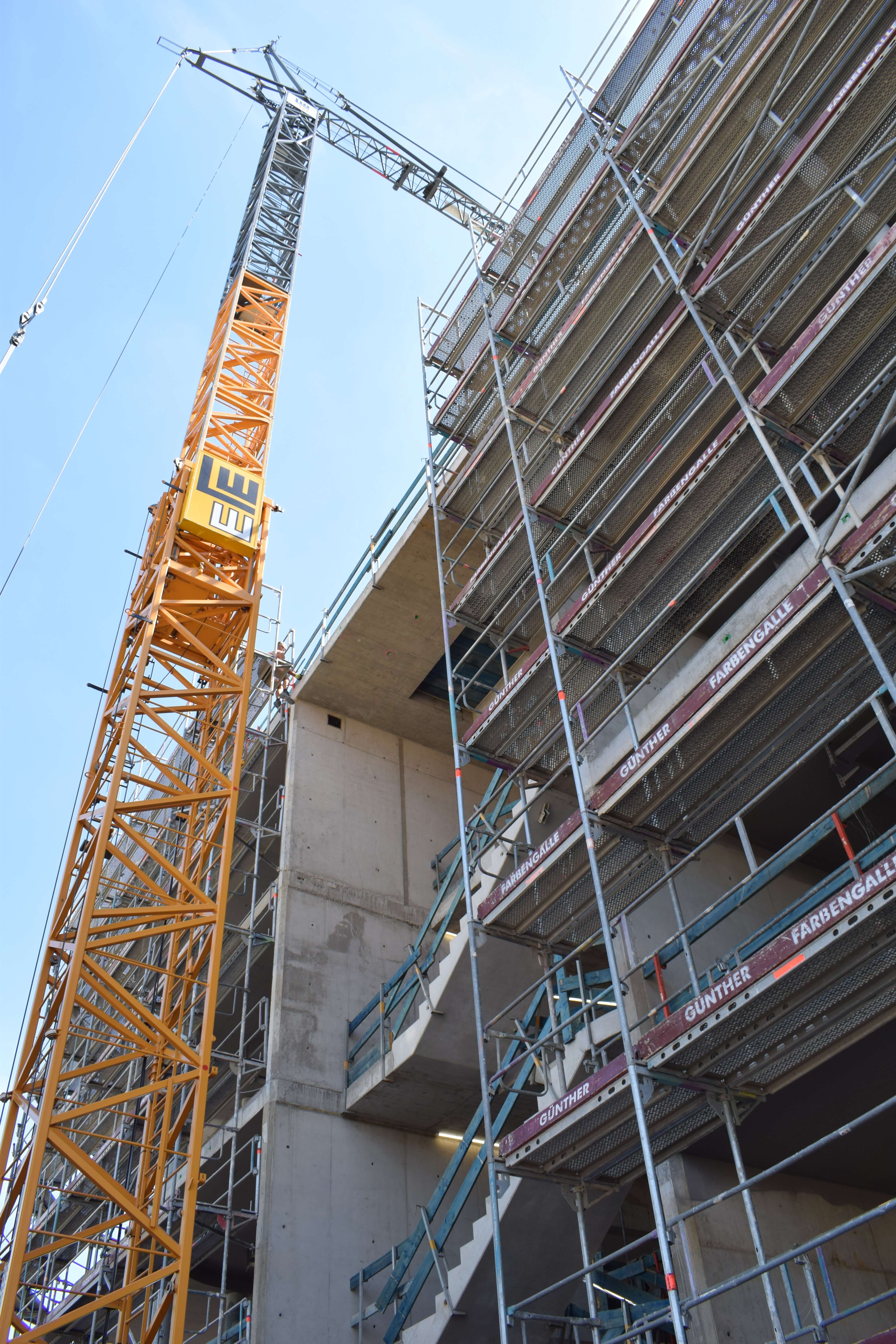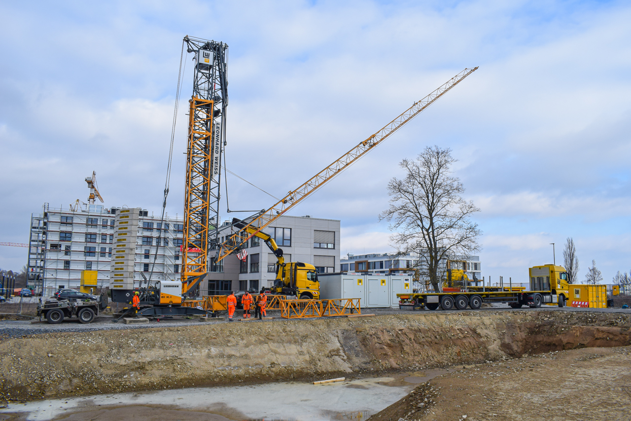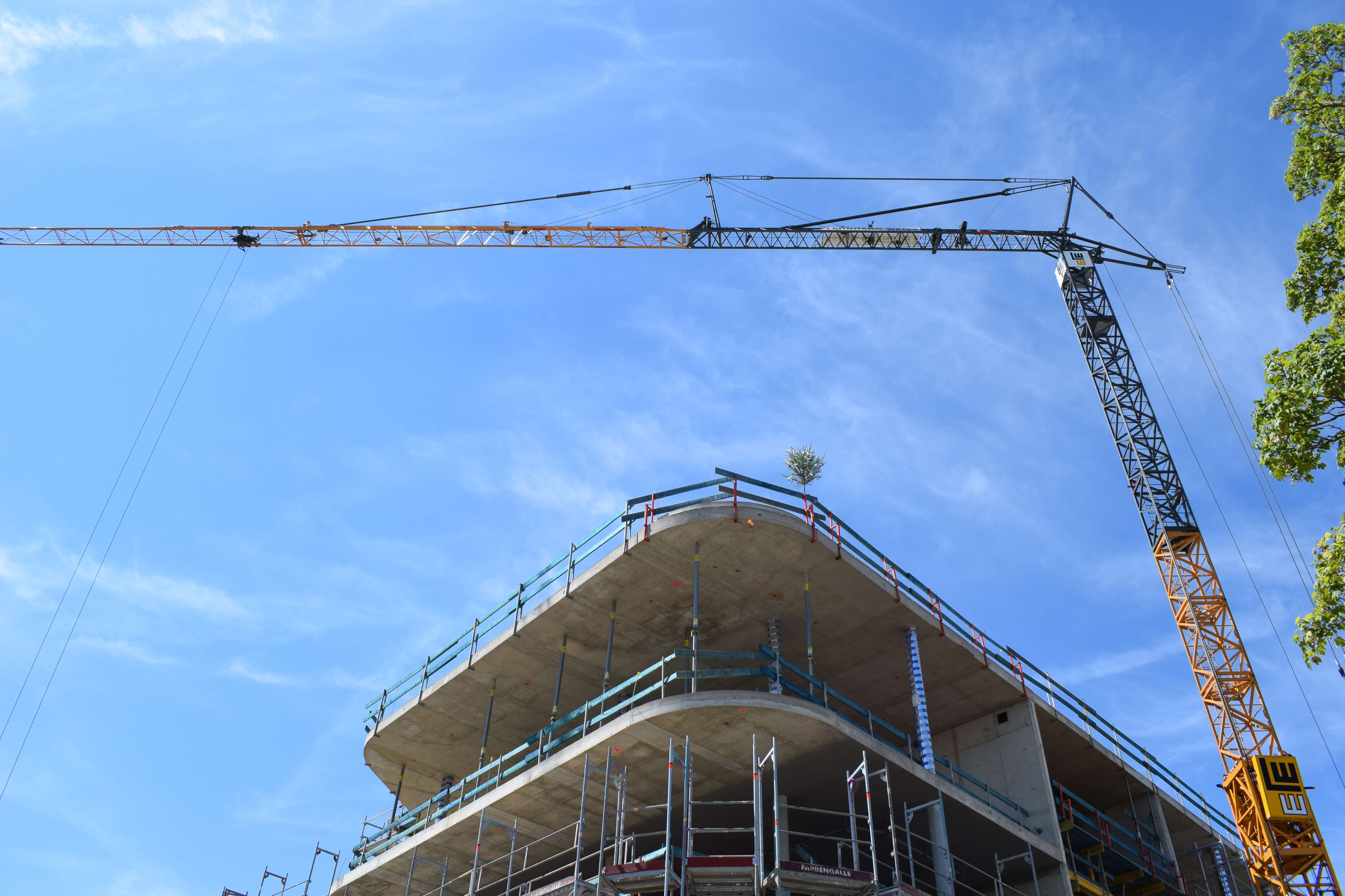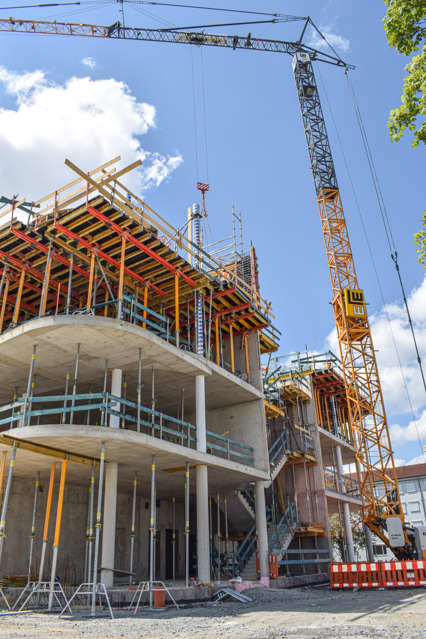 Der Kran ist der erste wichtige Step für die Hochbauphase - der Ingenieurbau kann damit starten! In den nächsten Schritten werden in Kürze die Schalungselemente für den Beton abgestellt. Dann folgen die Bewährungseisen für die Geschosse, damit der Bau steifer wird.