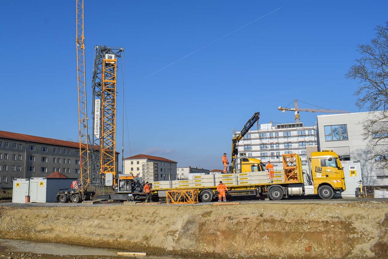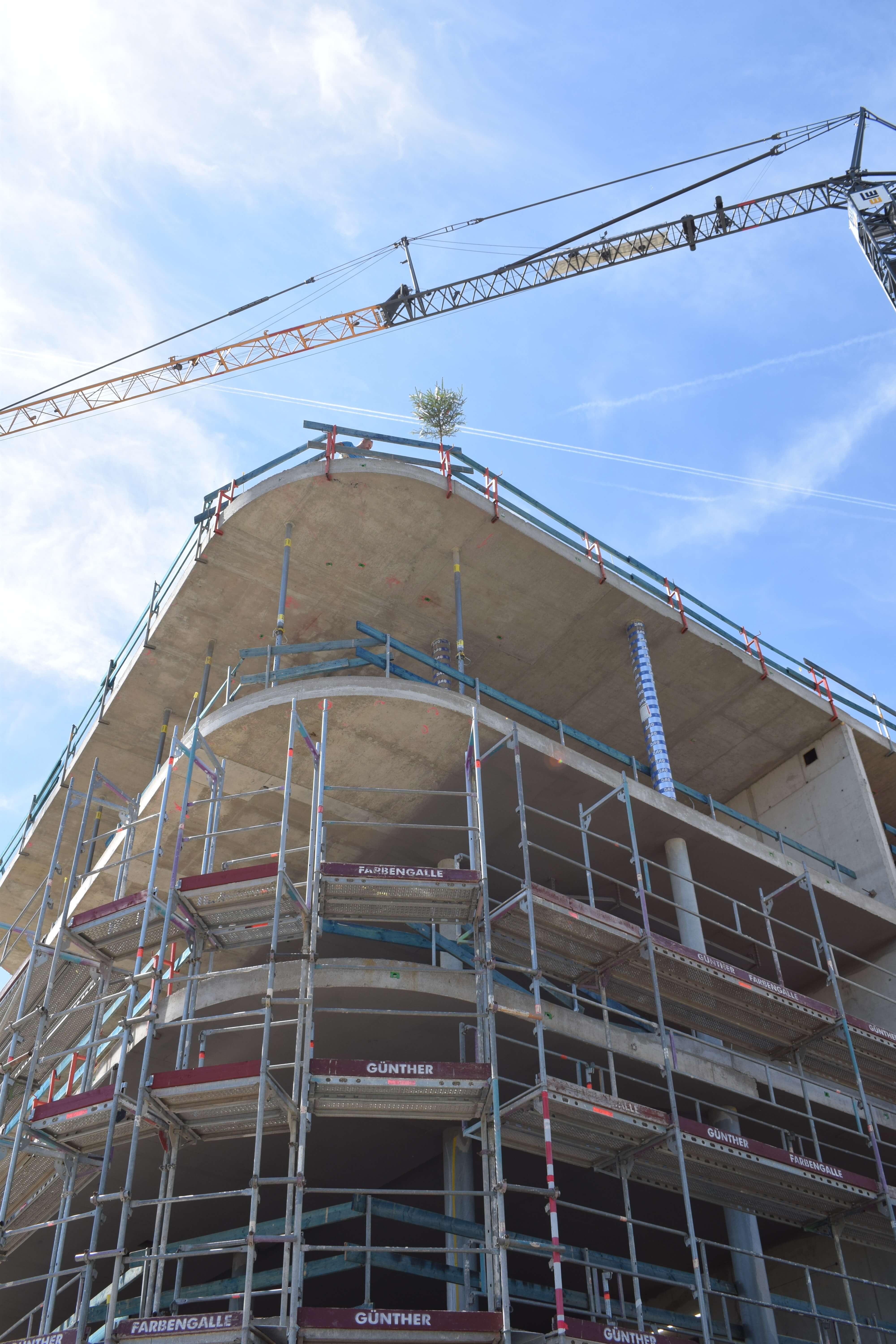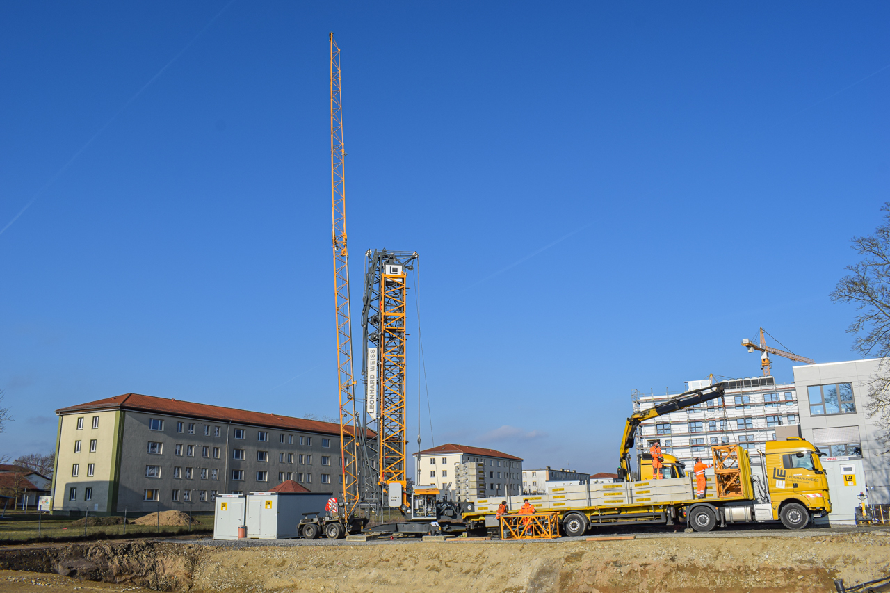 Der Kran ist der erste wichtige Step für die Hochbauphase - der Ingenieurbau kann damit starten! In den nächsten Schritten werden in Kürze die Schalungselemente für den Beton abgestellt. Dann folgen die Bewährungseisen für die Geschosse, damit der Bau steifer wird.
