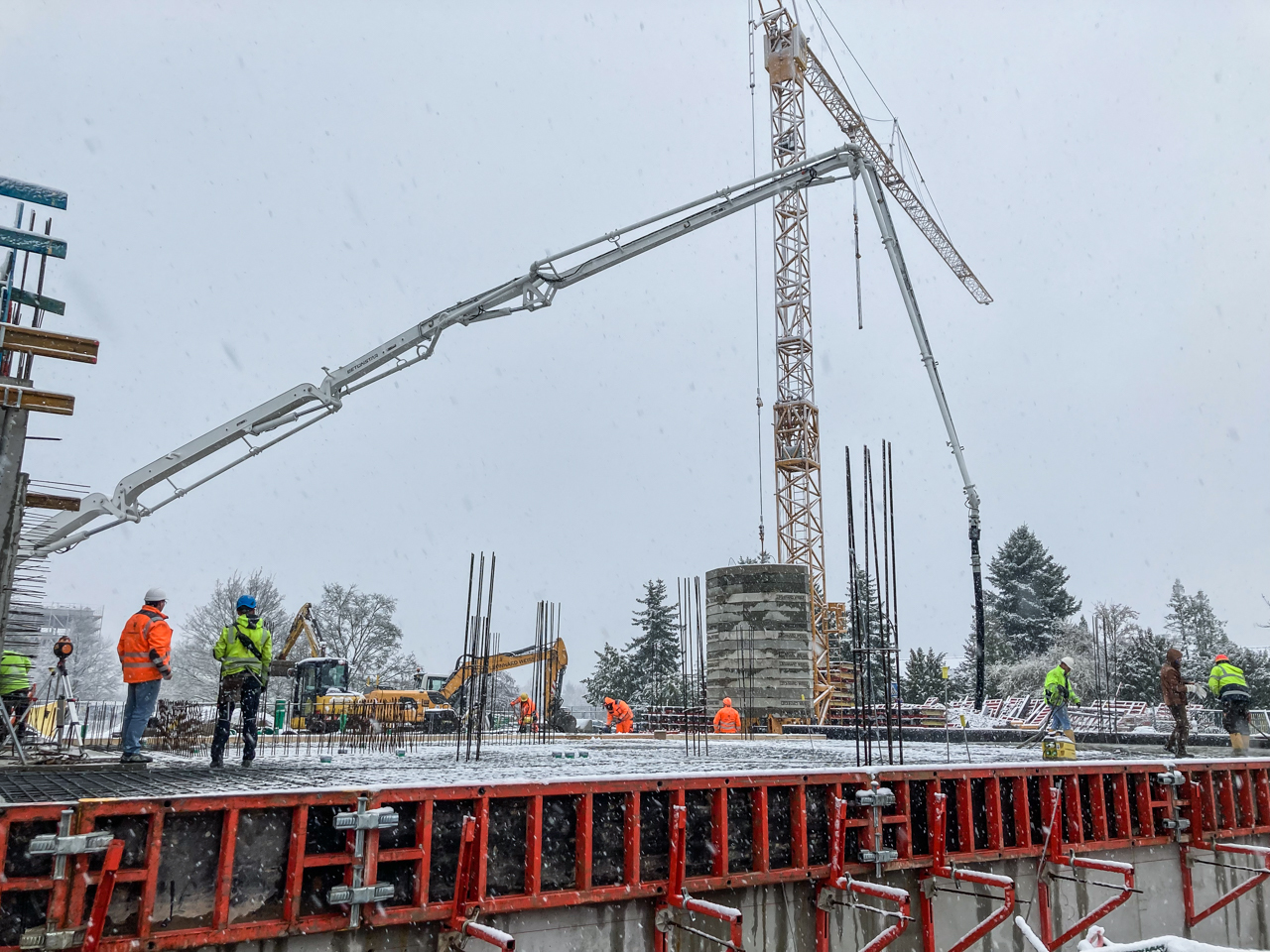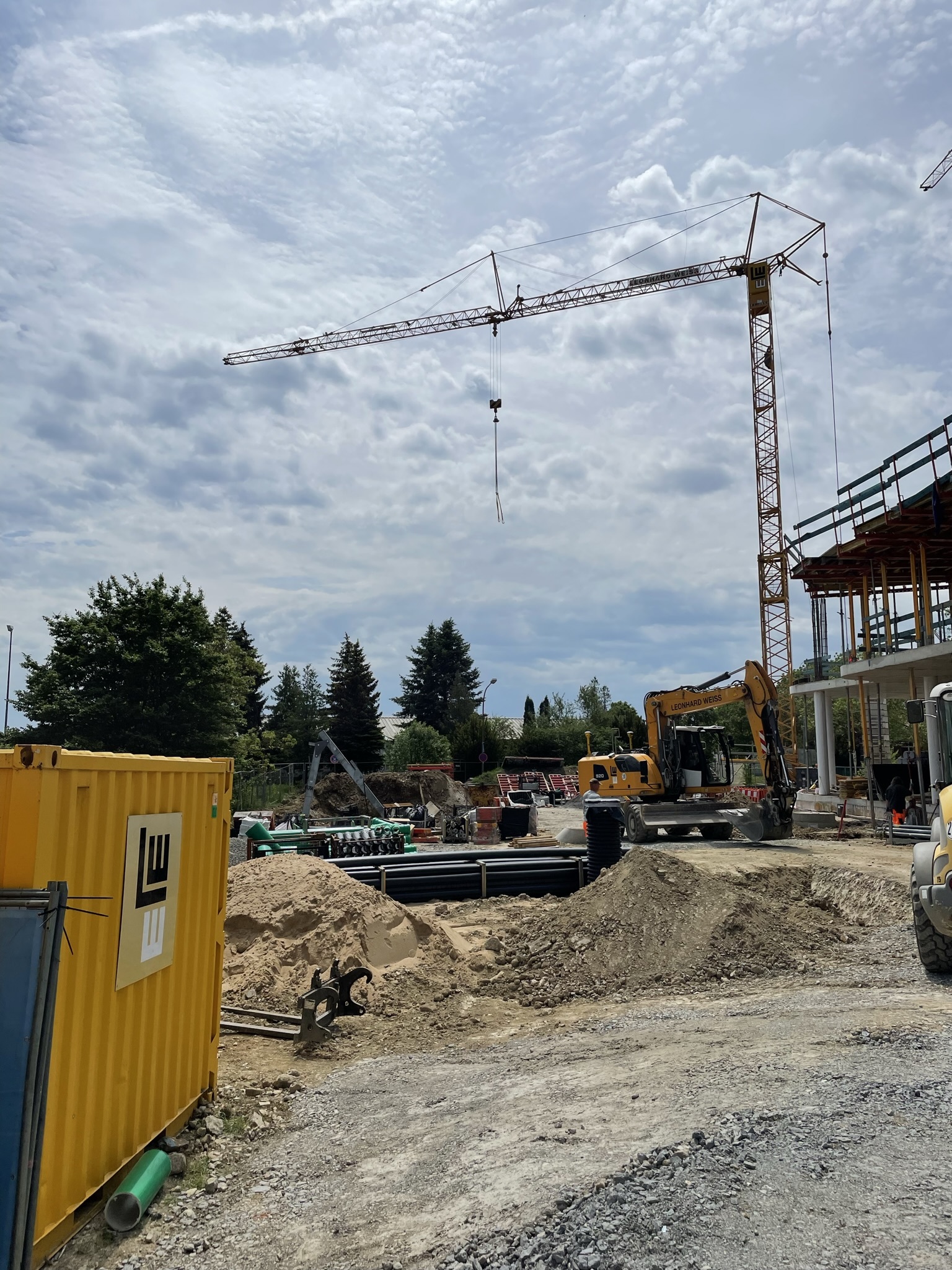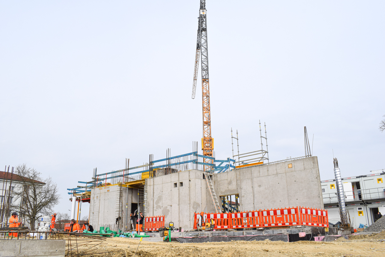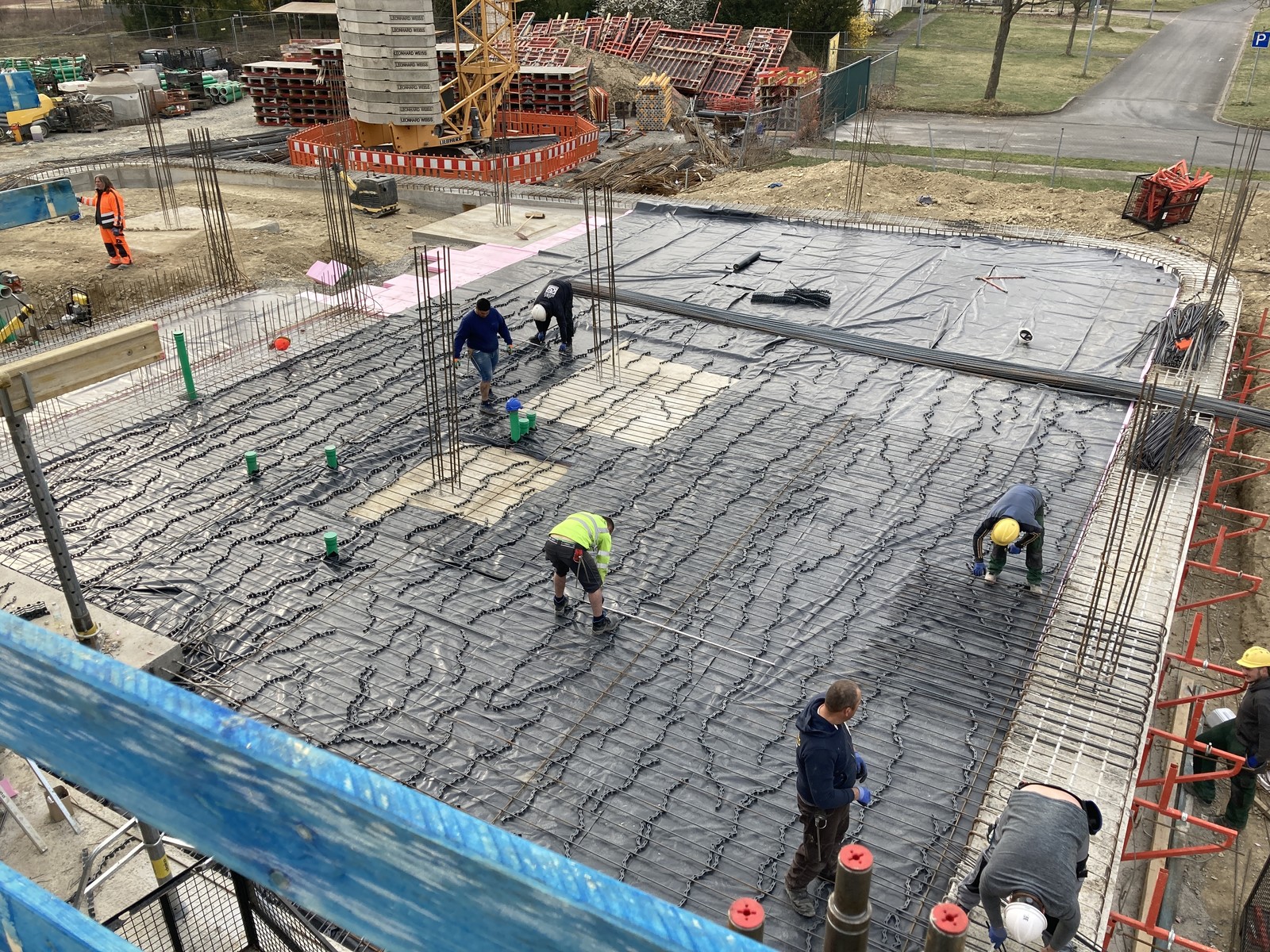 Der Kran ist der erste wichtige Step für die Hochbauphase - der Ingenieurbau kann damit starten! In den nächsten Schritten werden in Kürze die Schalungselemente für den Beton abgestellt. Dann folgen die Bewährungseisen für die Geschosse, damit der Bau steifer wird.