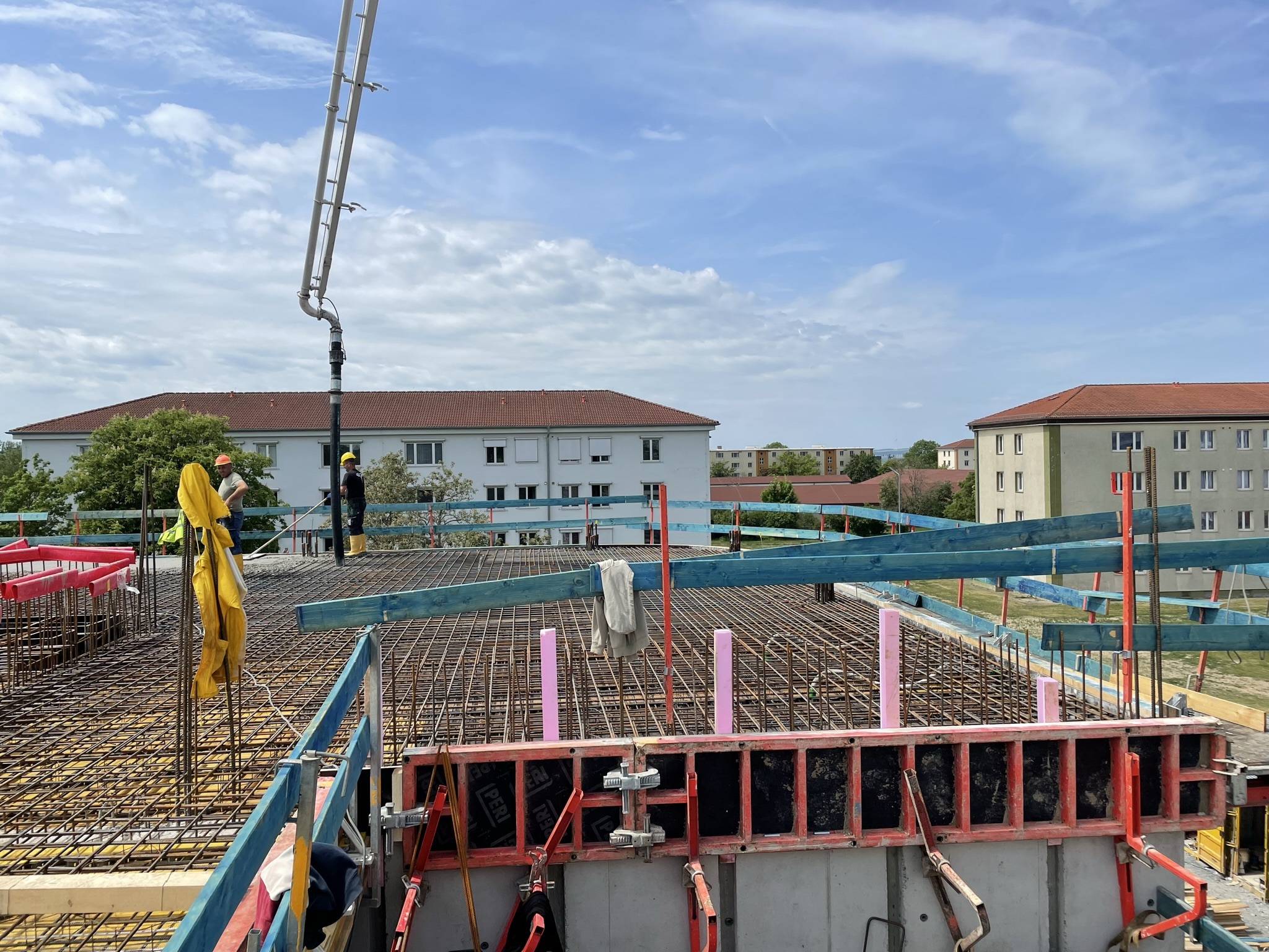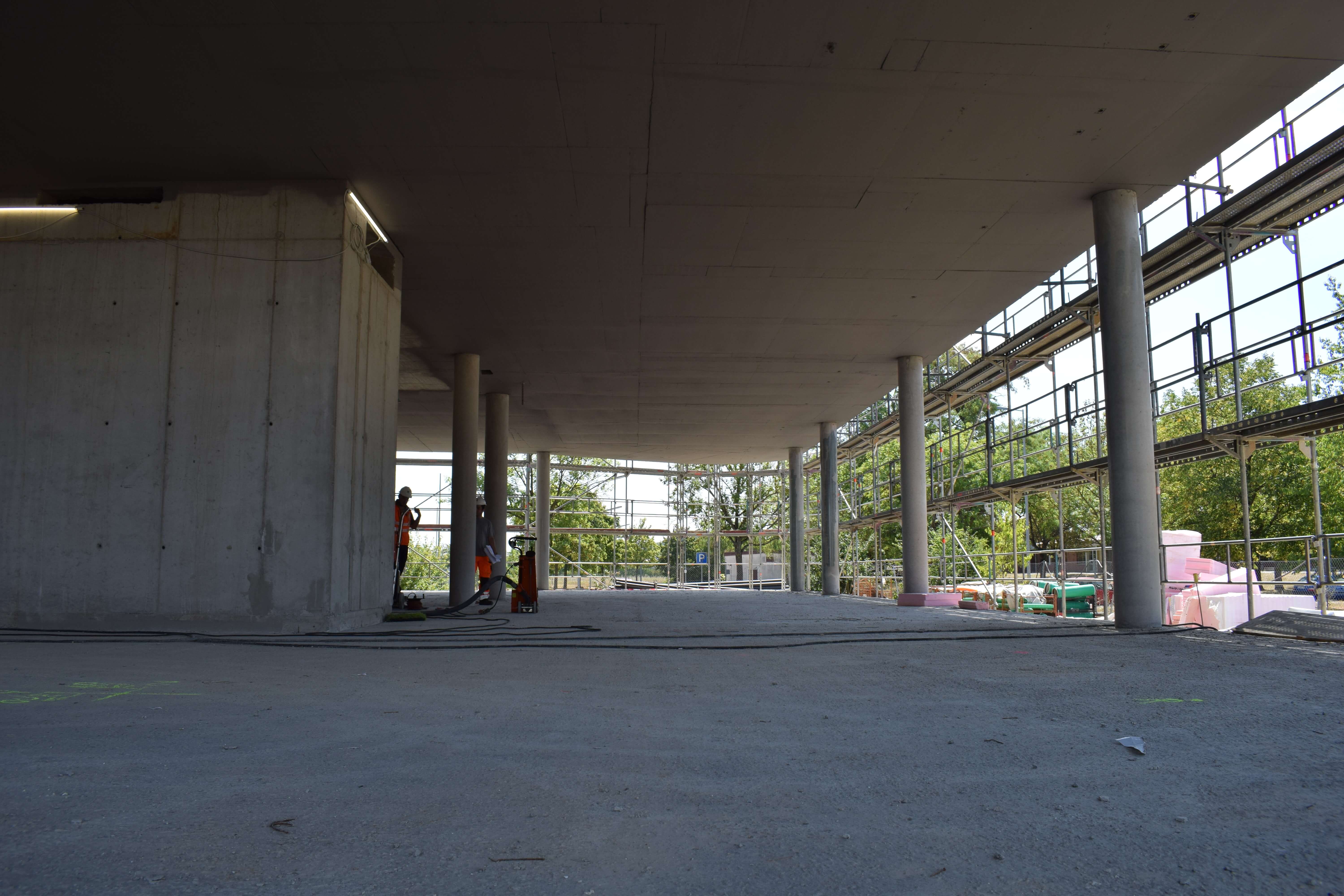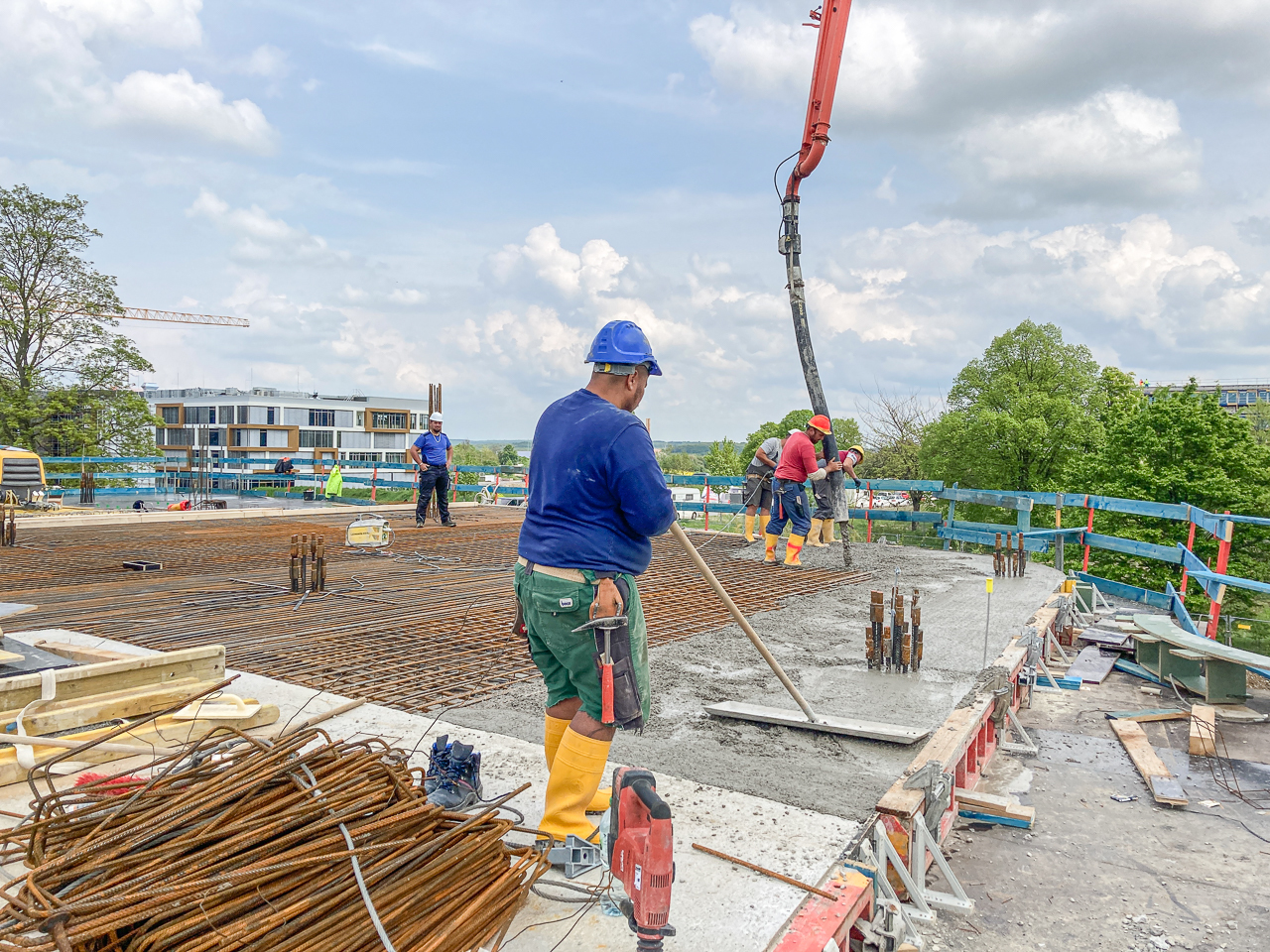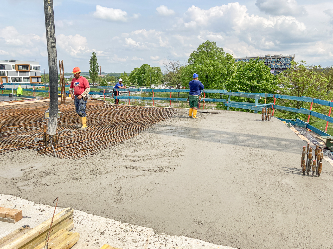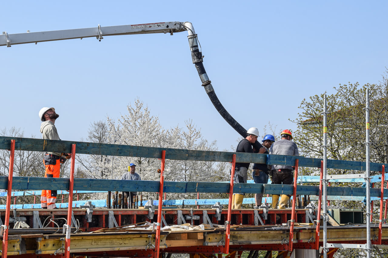 Der erste Stock des SKYONE.offices ist fast fertig! Nach dem Erstellen der Wände und des Treppenhauses ist nun die Decke des ersten Stockwerks dran. Aktuell wird Beton eingebracht und glattgezogen.