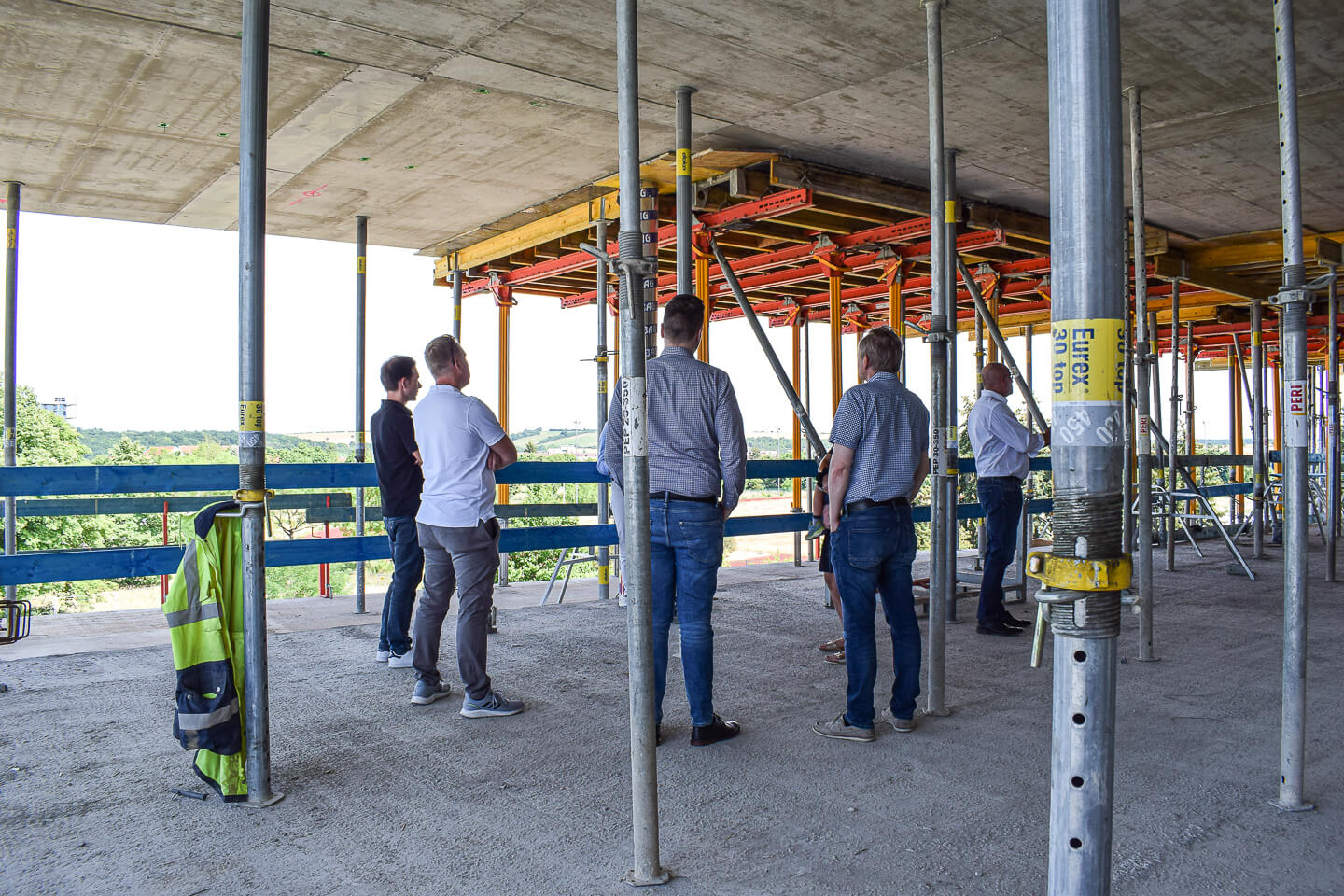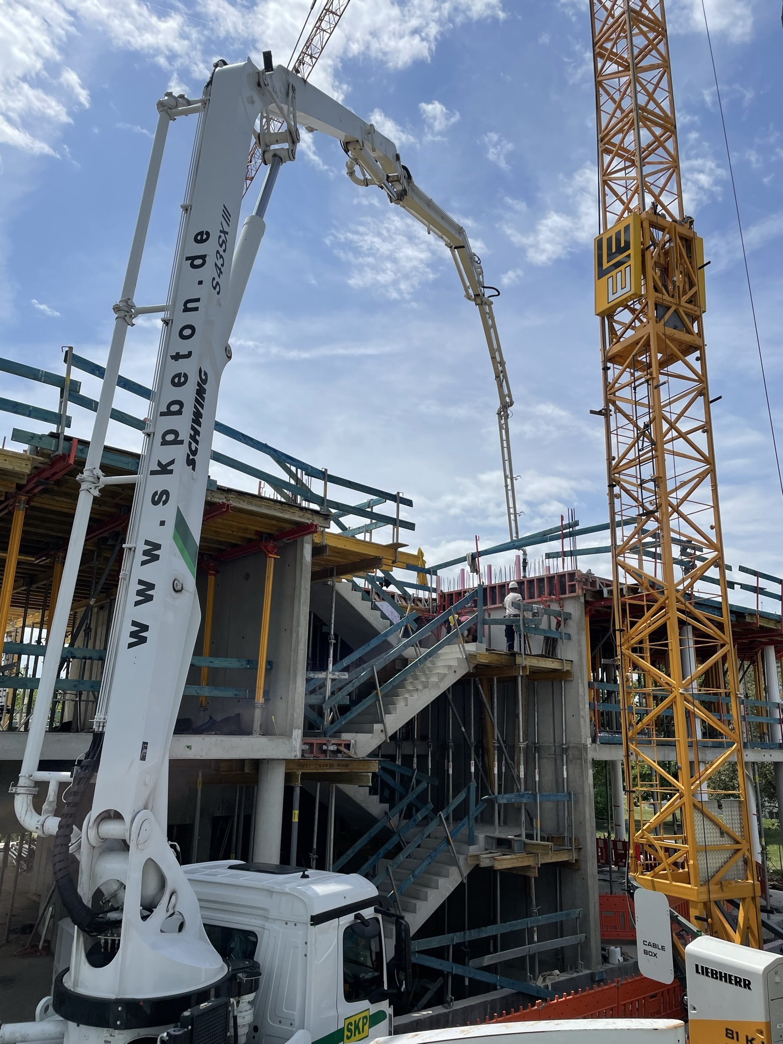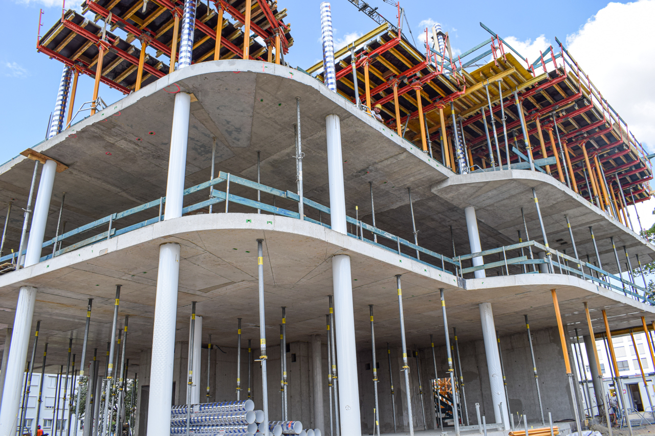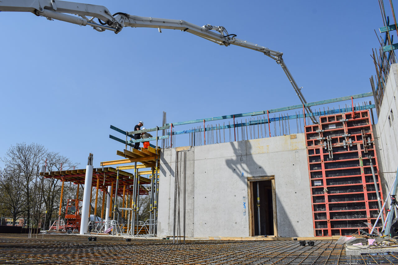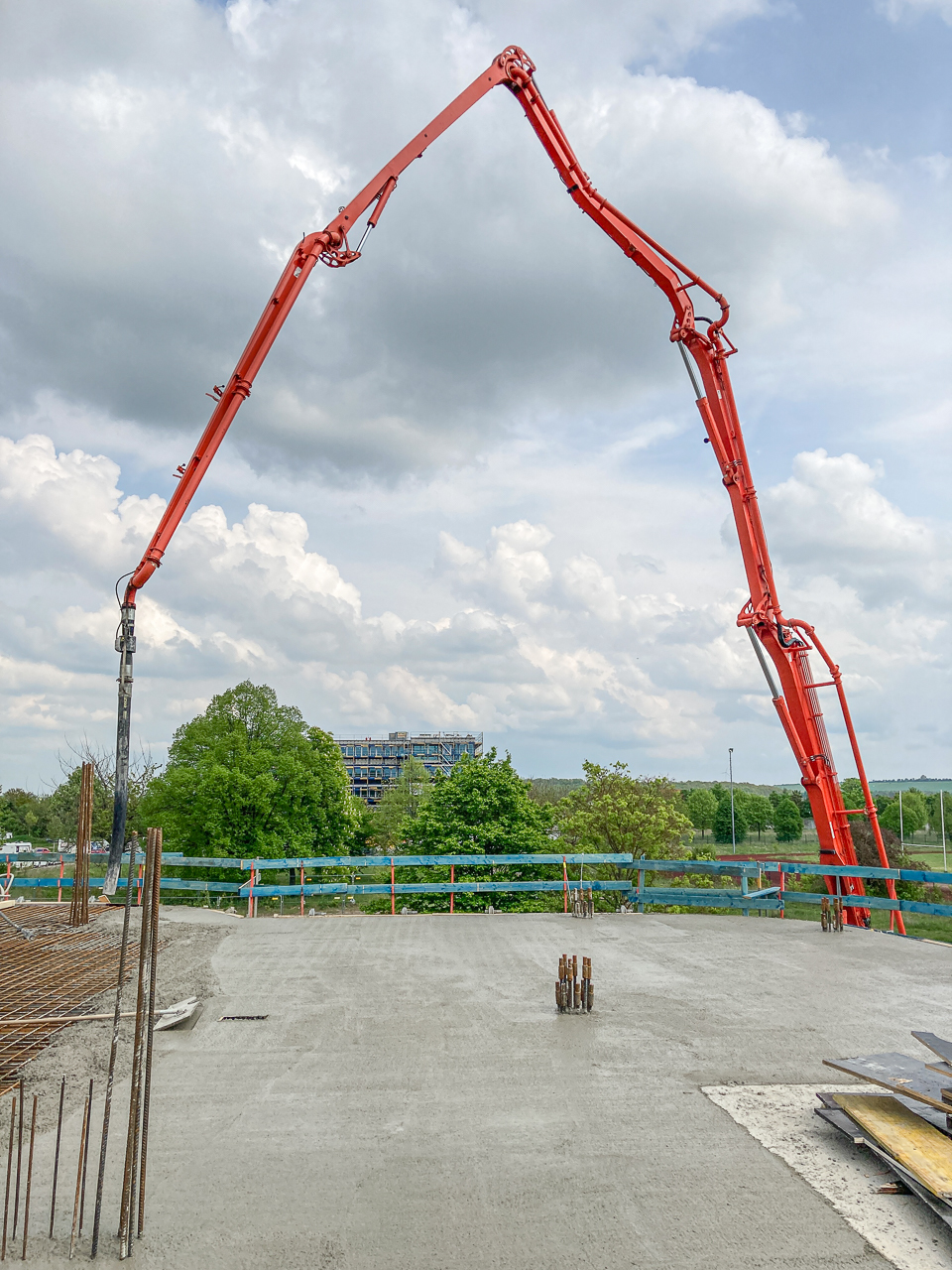Der erste Stock des SKYONE.offices ist fast fertig! Nach dem Erstellen der Wände und des Treppenhauses ist nun die Decke des ersten Stockwerks dran. Aktuell wird Beton eingebracht und glattgezogen.