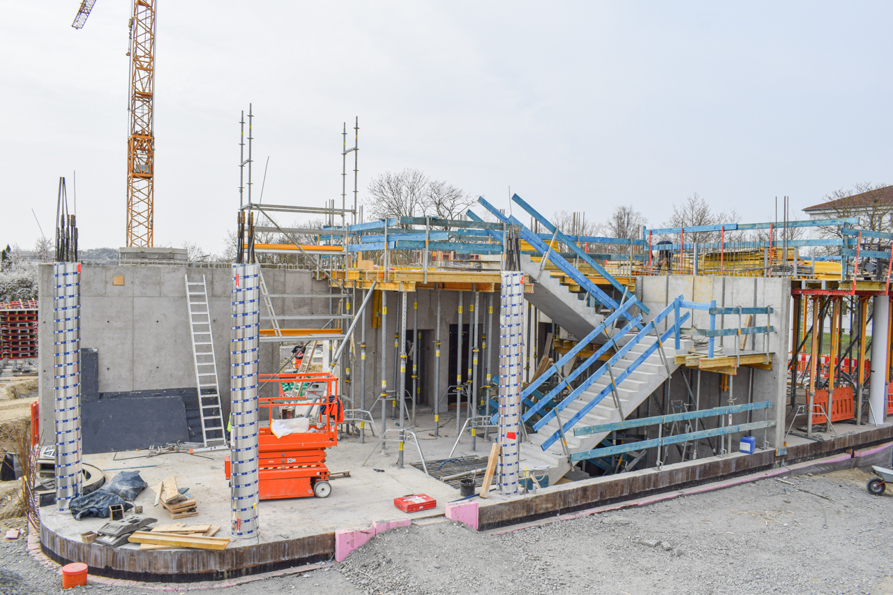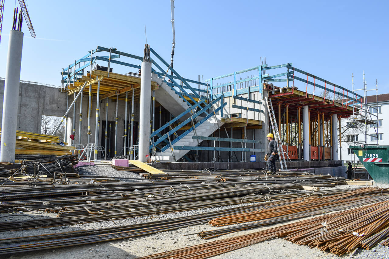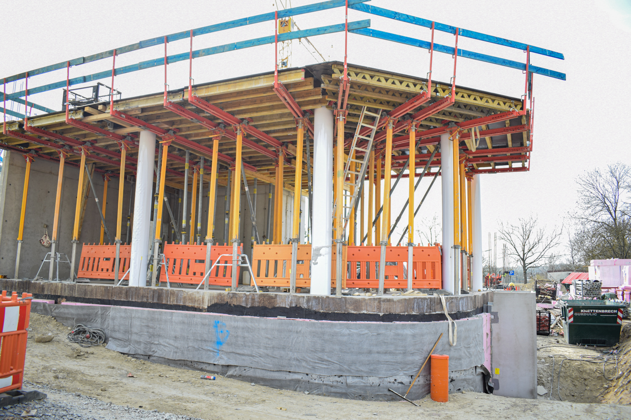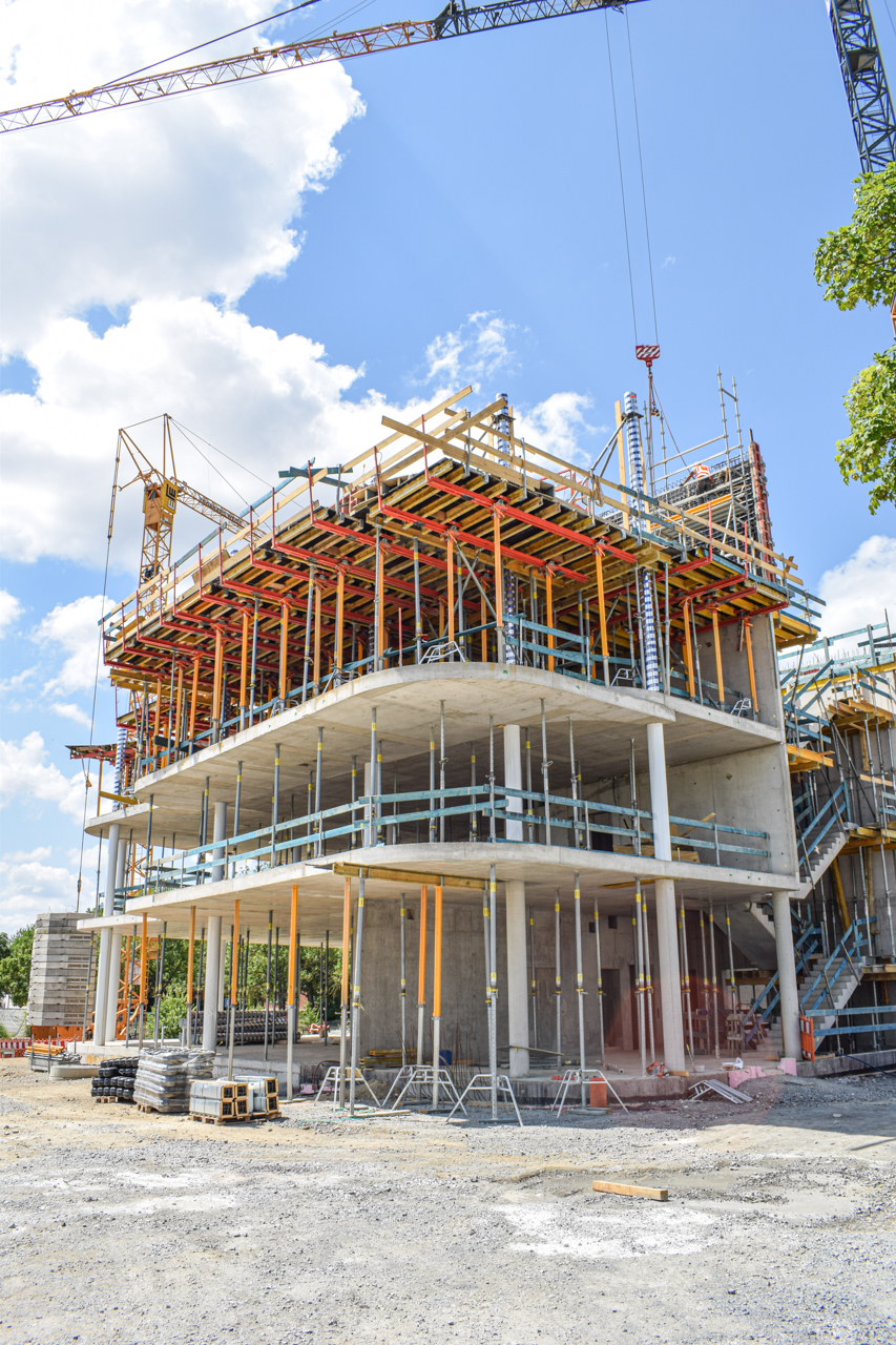 Der Rohbau des Eingangsbereichs im Erdgeschoss steht, die Treppenläufe für den Aufgang in das 1. Obergeschoss sind gesetzt und die erste Deckenschalung wurden vorbereitet. Jetzt lässt sich die spätere Geometrie des SKYONE.offices schon erkennen.