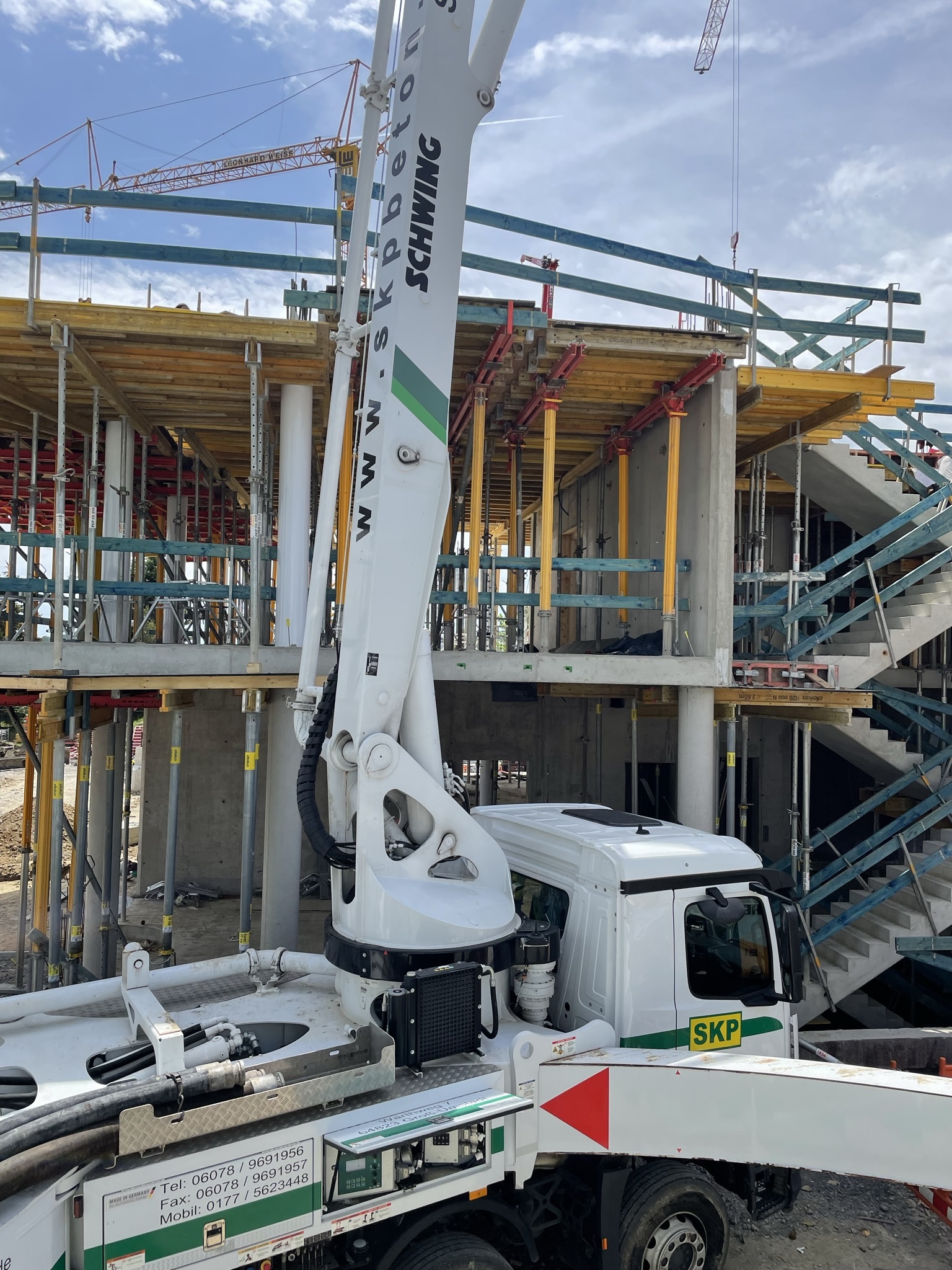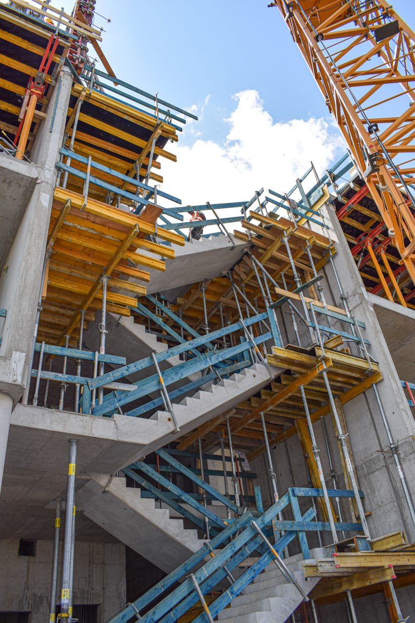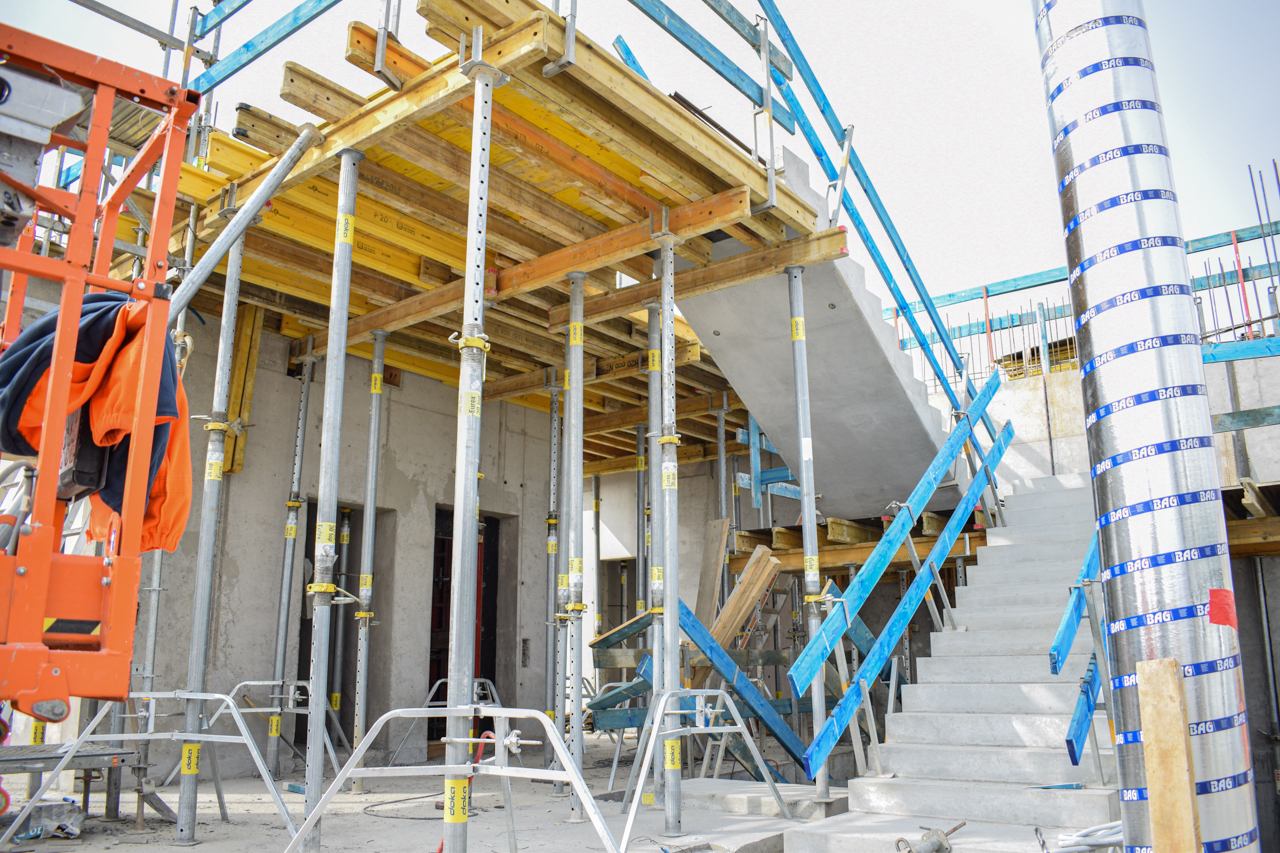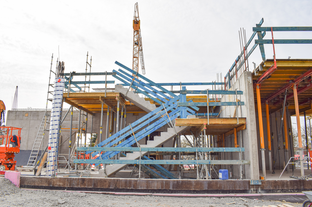 Der Rohbau des Eingangsbereichs im Erdgeschoss steht, die Treppenläufe für den Aufgang in das 1. Obergeschoss sind gesetzt und die erste Deckenschalung wurden vorbereitet. Jetzt lässt sich die spätere Geometrie des SKYONE.offices schon erkennen.