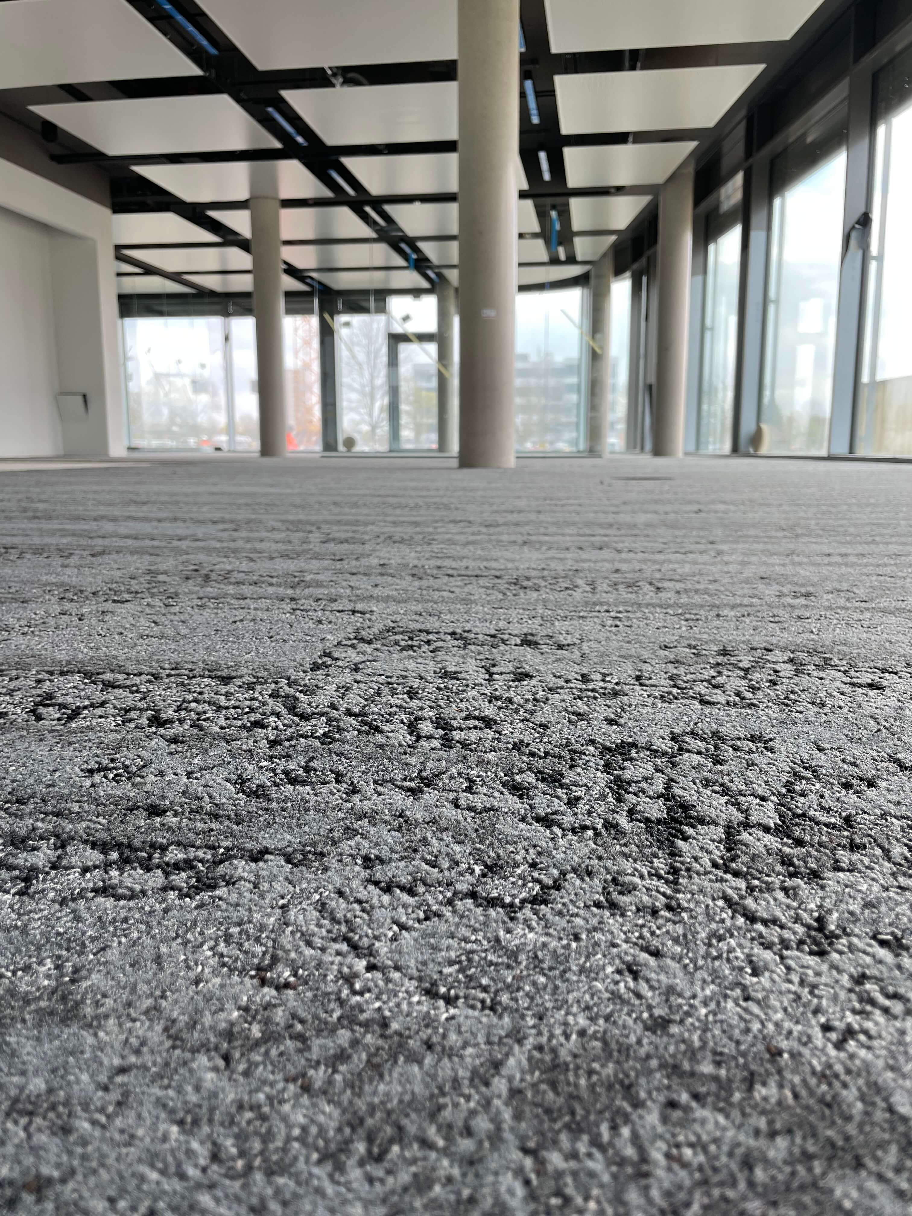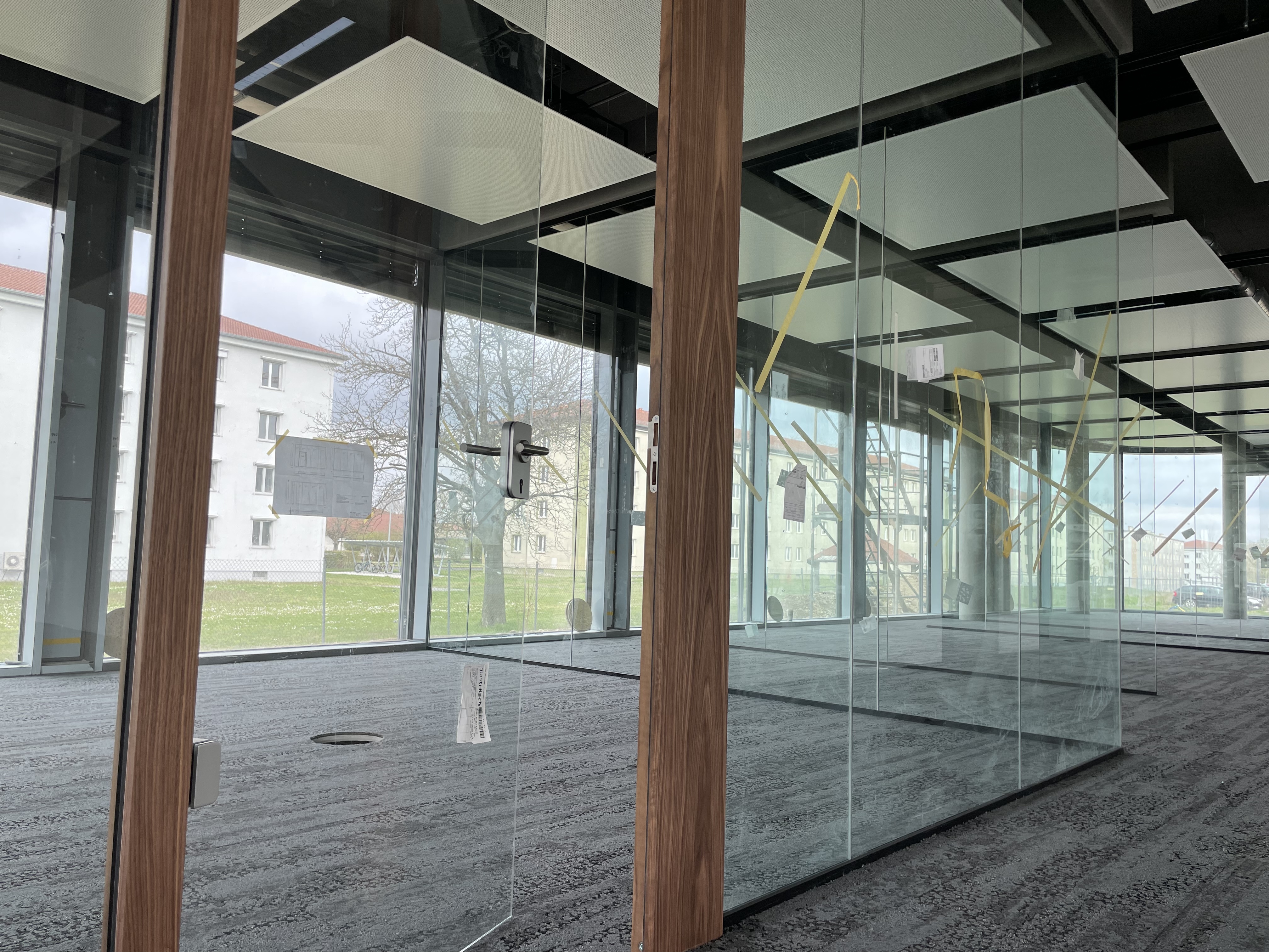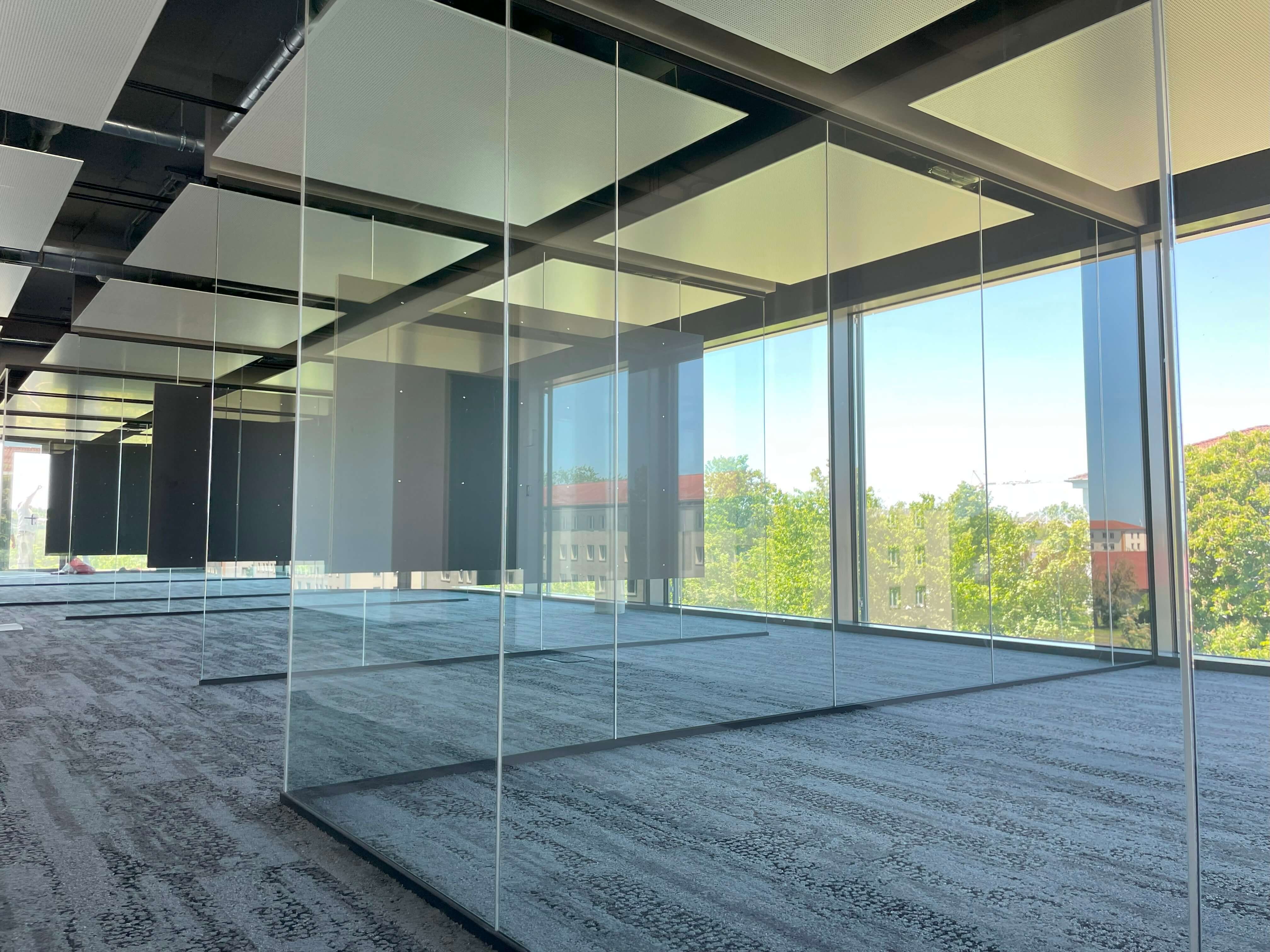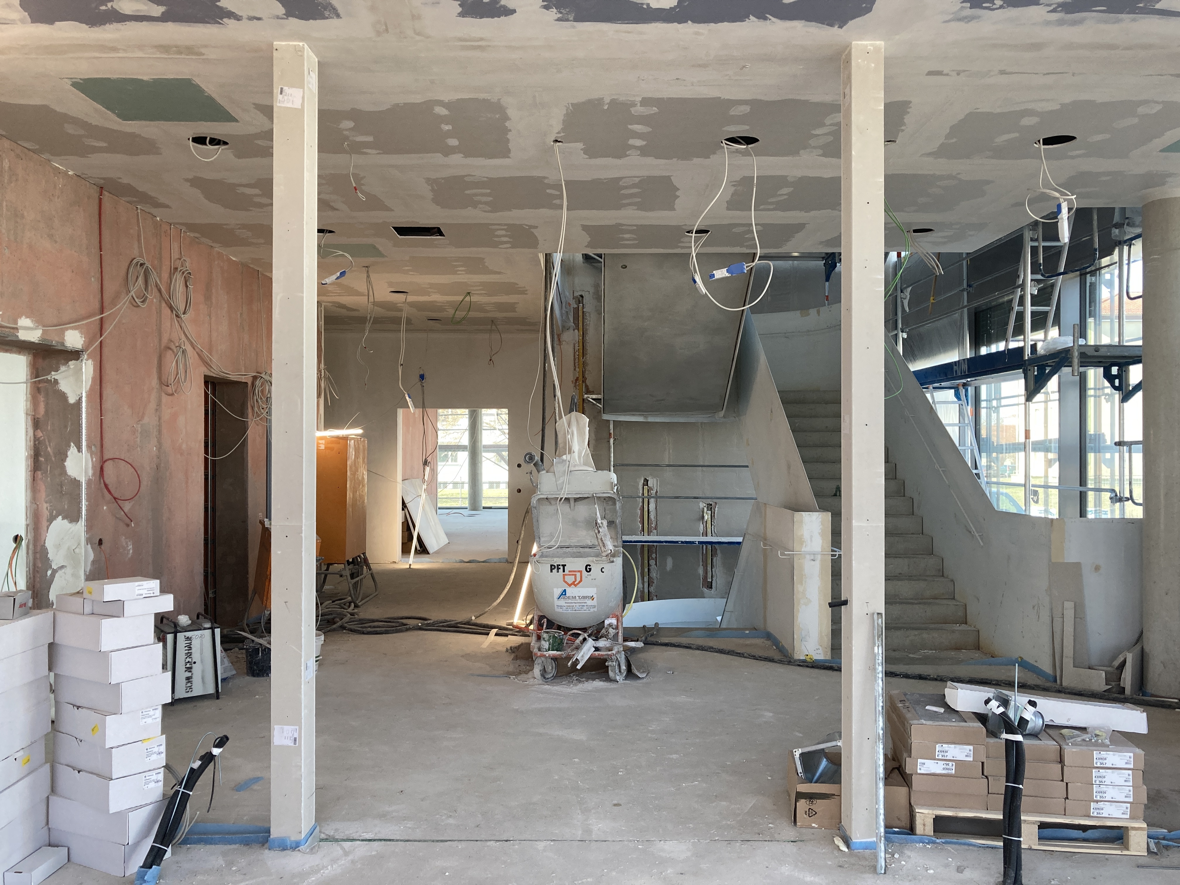 Die neue Karusselltür im Eingangsbereich begrüßt bald unsere Kunden und symbolisiert den Beginn einer neuen Ära. Die ersten Teppichbereiche sind verlegt und geben den Räumen ein neues Aussehen und eine angenehme Atmosphäre. Auch im Treppenbereich geht es voran, Schritt für Schritt werden die Fliesenarbeiten umgesetzt und der Bereich erstrahlt schon bald in neuem Glanz. Ein Blick nach oben zeigt die Installation der Deckensegel in den Büros, welche den Arbeitsplatzkomfort erhöhen. Die Glastrennwände auf den Etagen geben eine klare Trennung zwischen den Bereichen und schaffen gleichzeitig eine offene Atmosphäre.