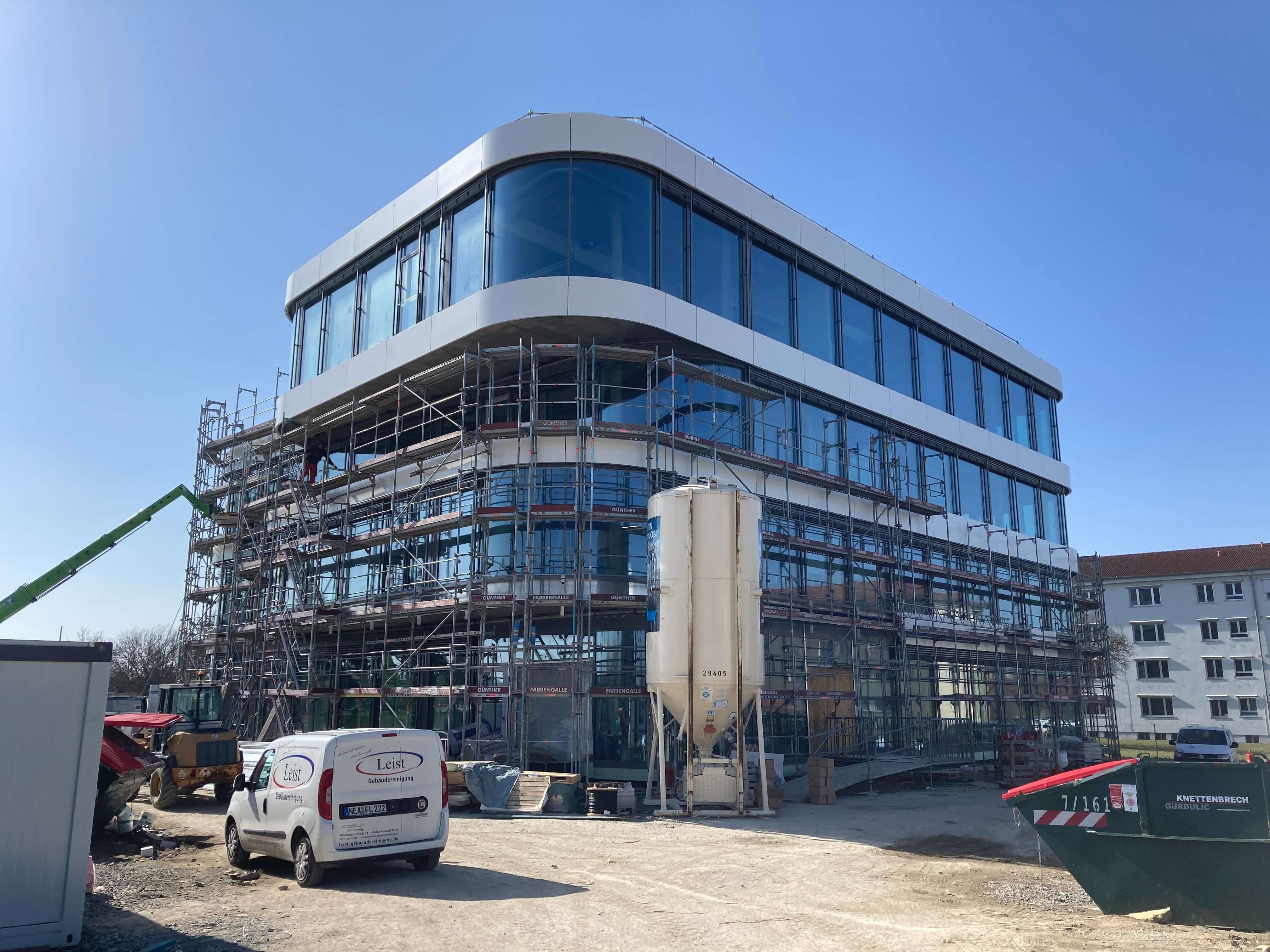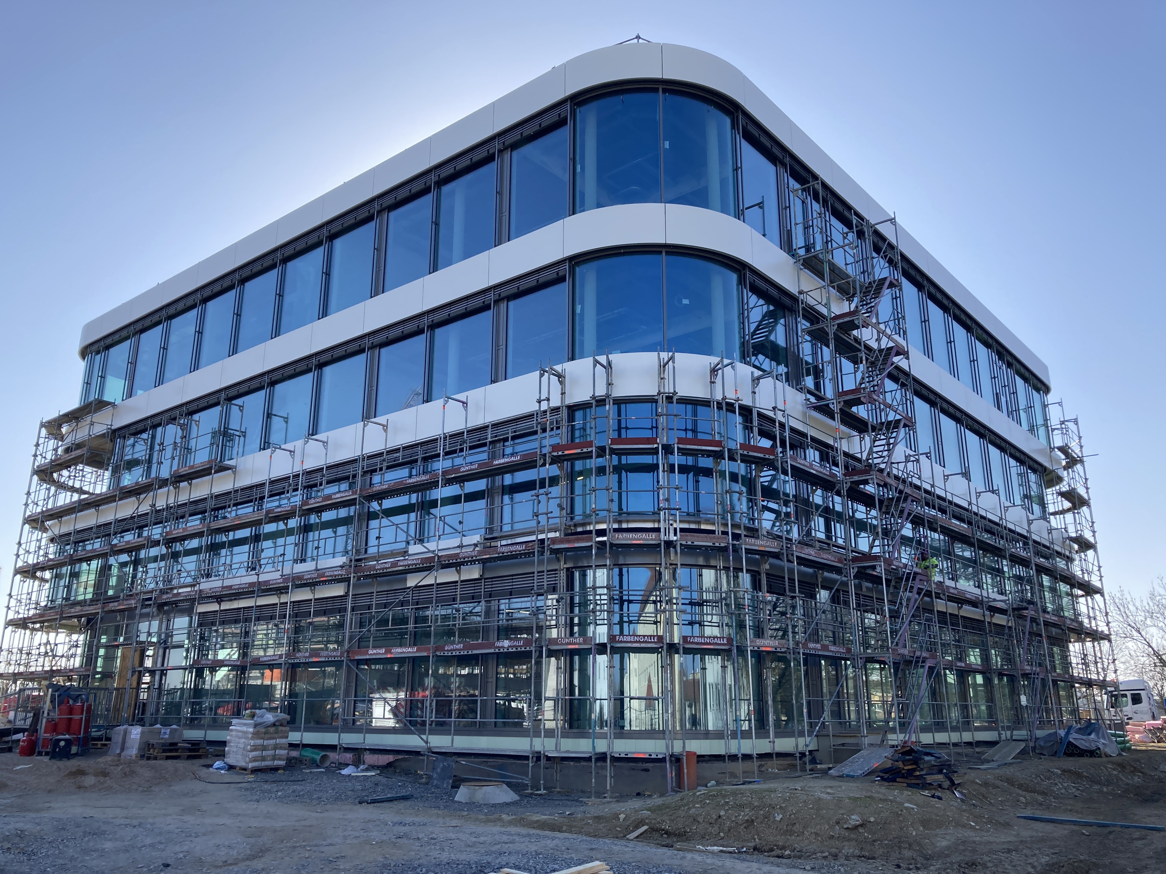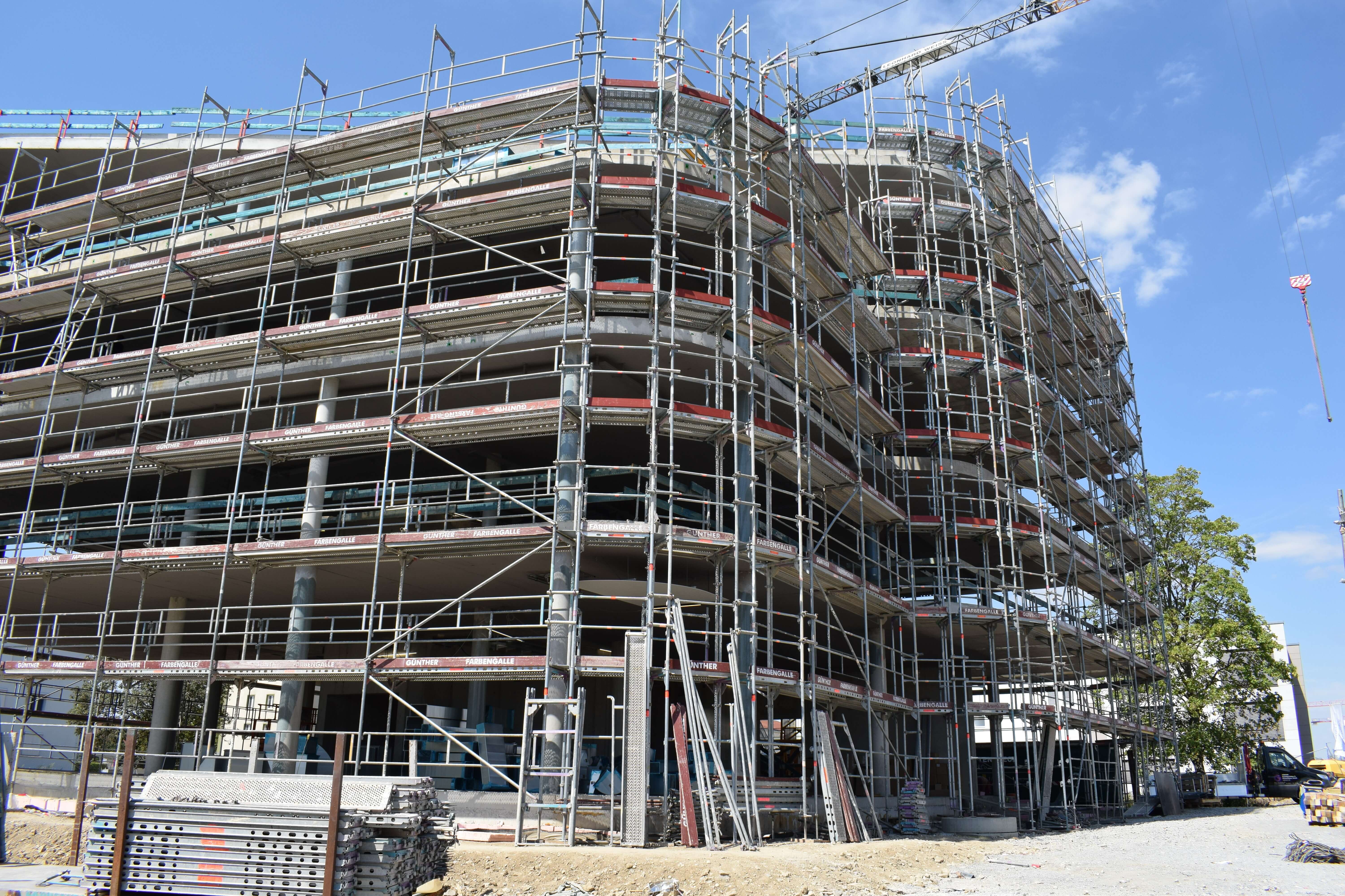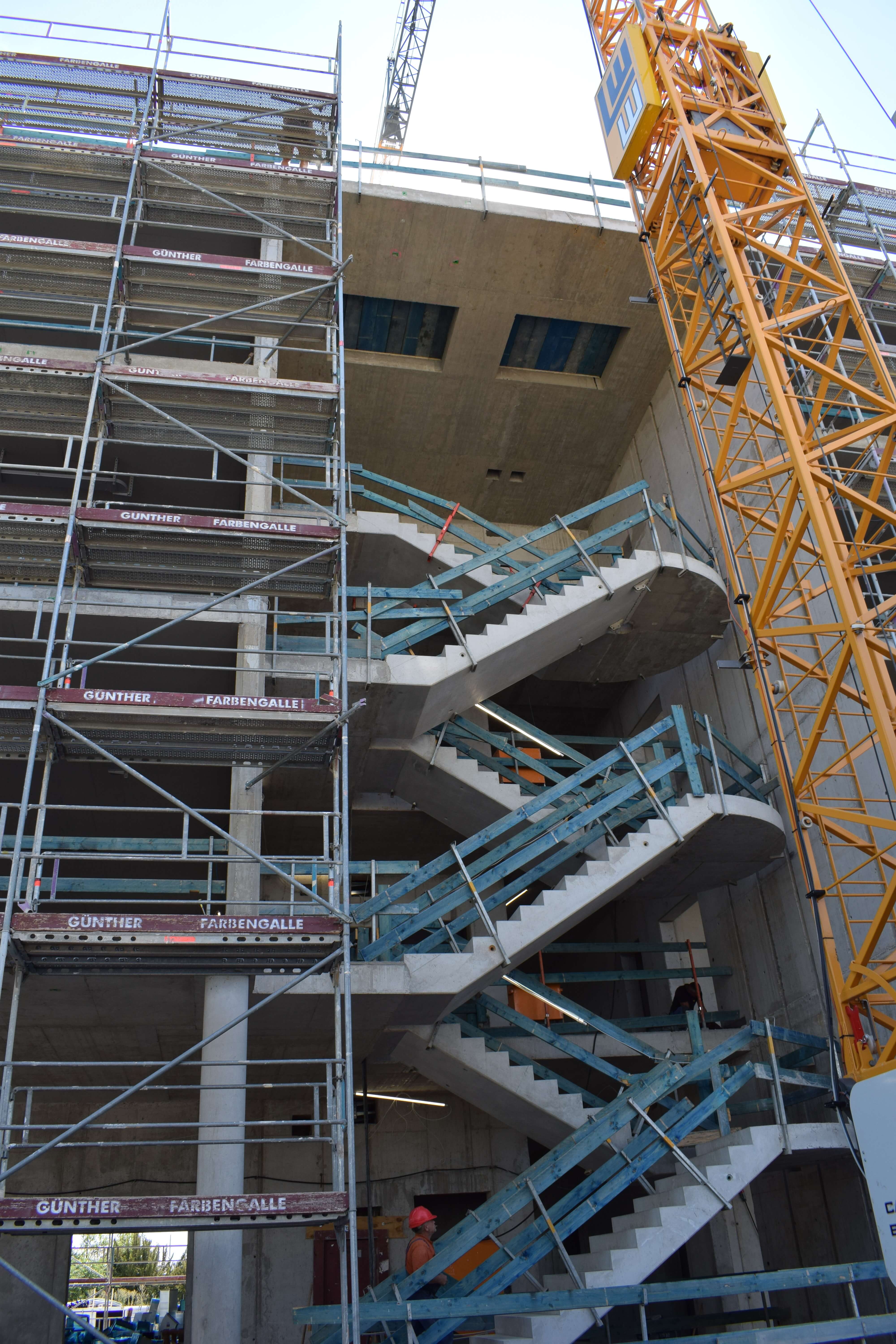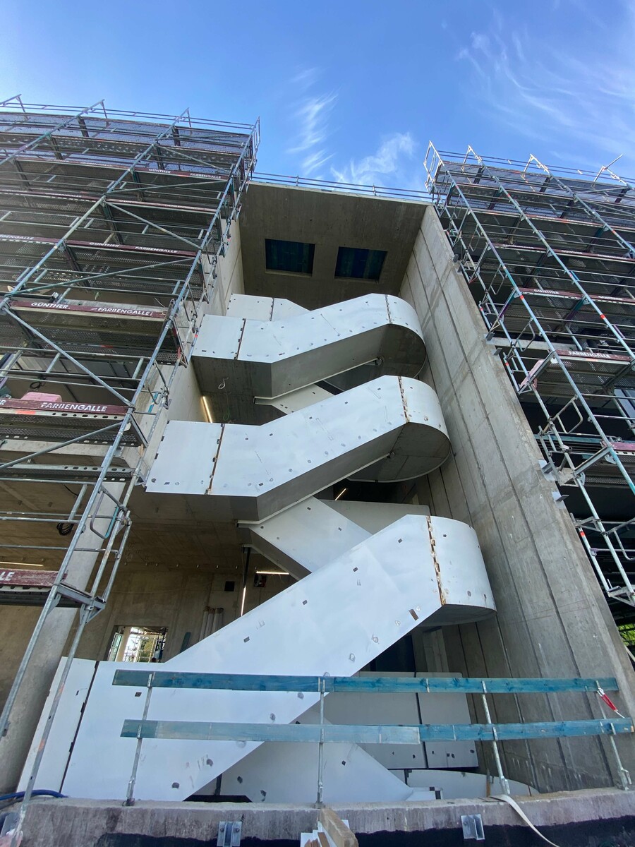 Das Fassadengerüst steht vollständig und auch die später sichtbaren Decken in den Bürobereichen sind bereits gestrichen. Die freitragende Faltwerktreppe wird im weiteren Verlauf mit Stahlblechgeländern ausgestattet. Der Rohbauer hat fast sein Werk getan und die Baustelle wird gerade von ihm beräumt, damit die Folgegewerke starten können.