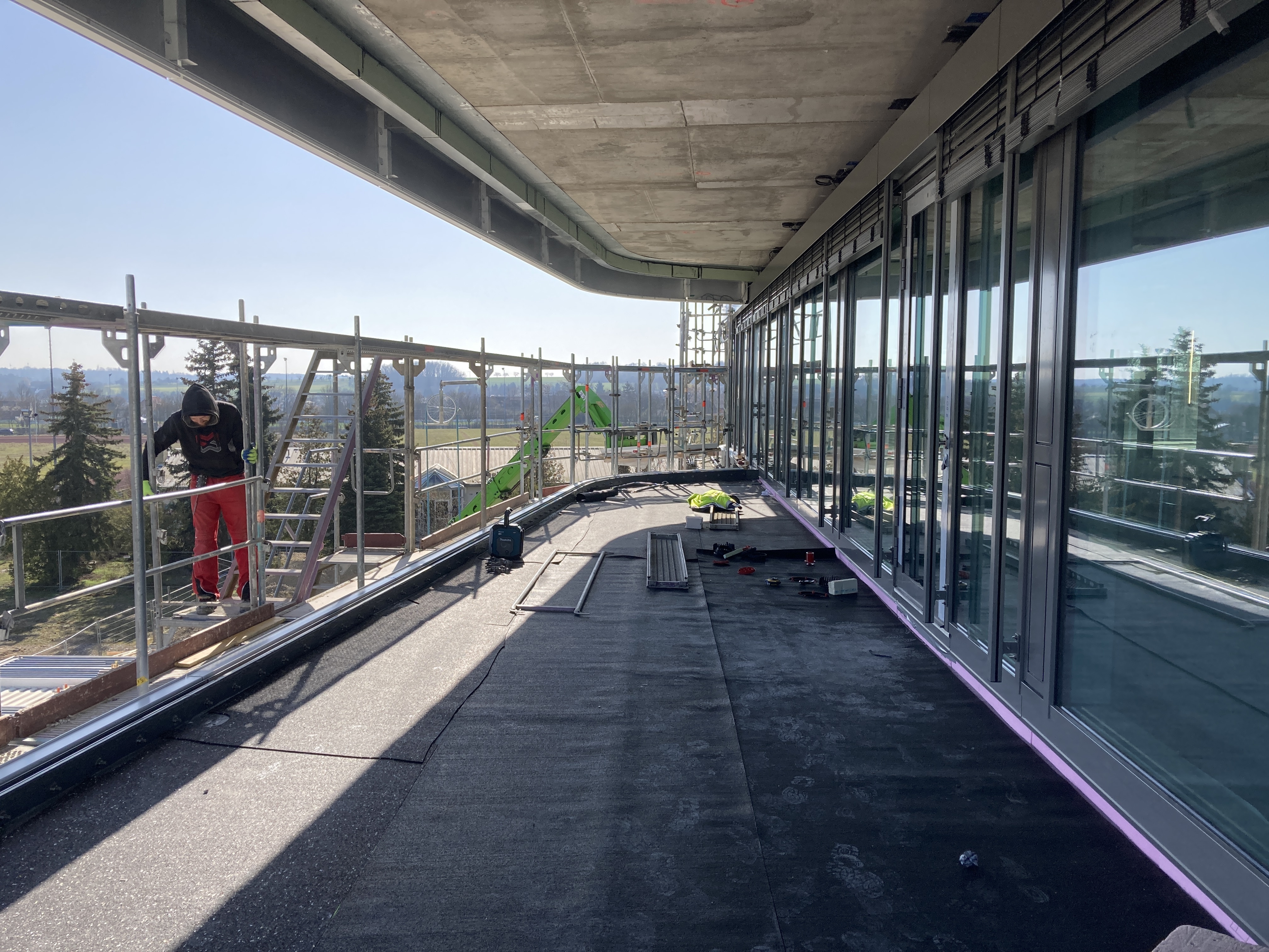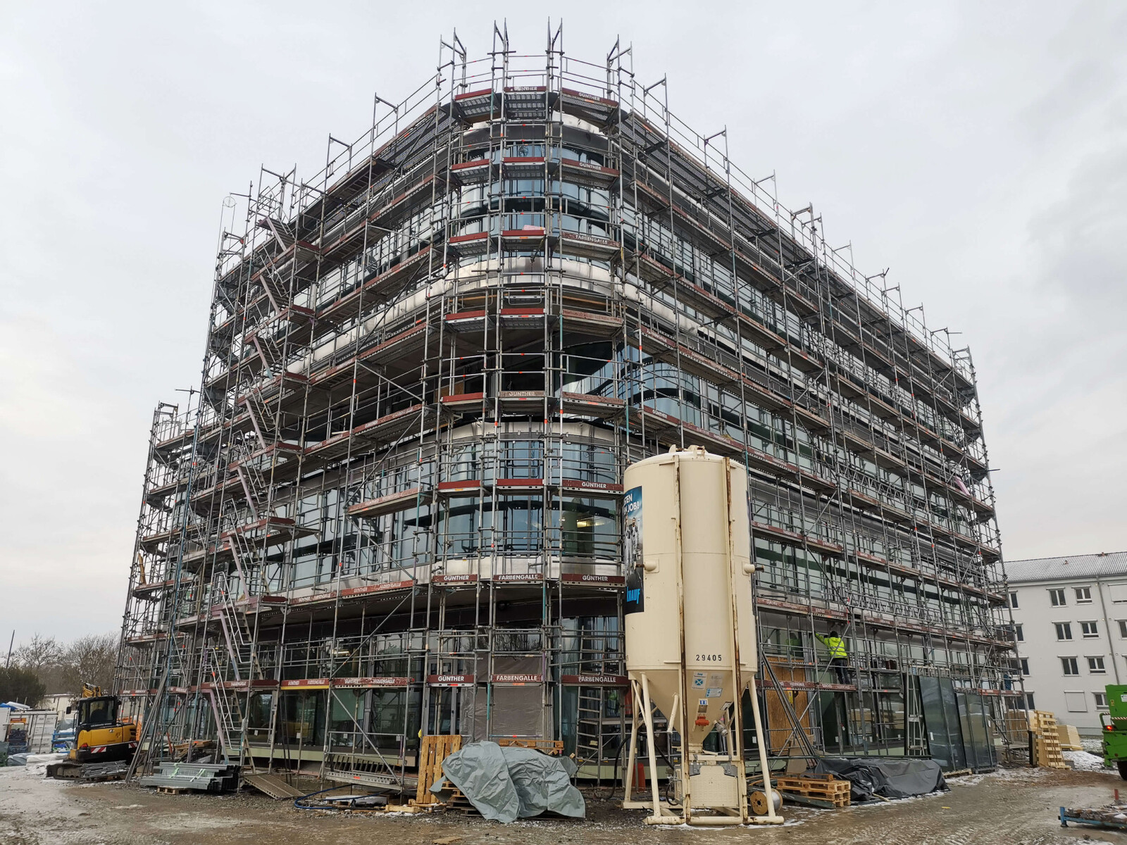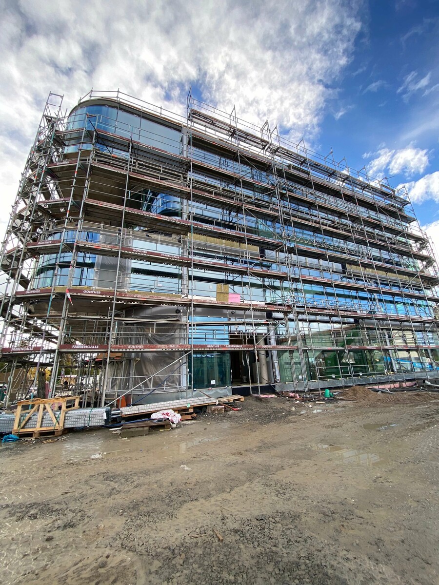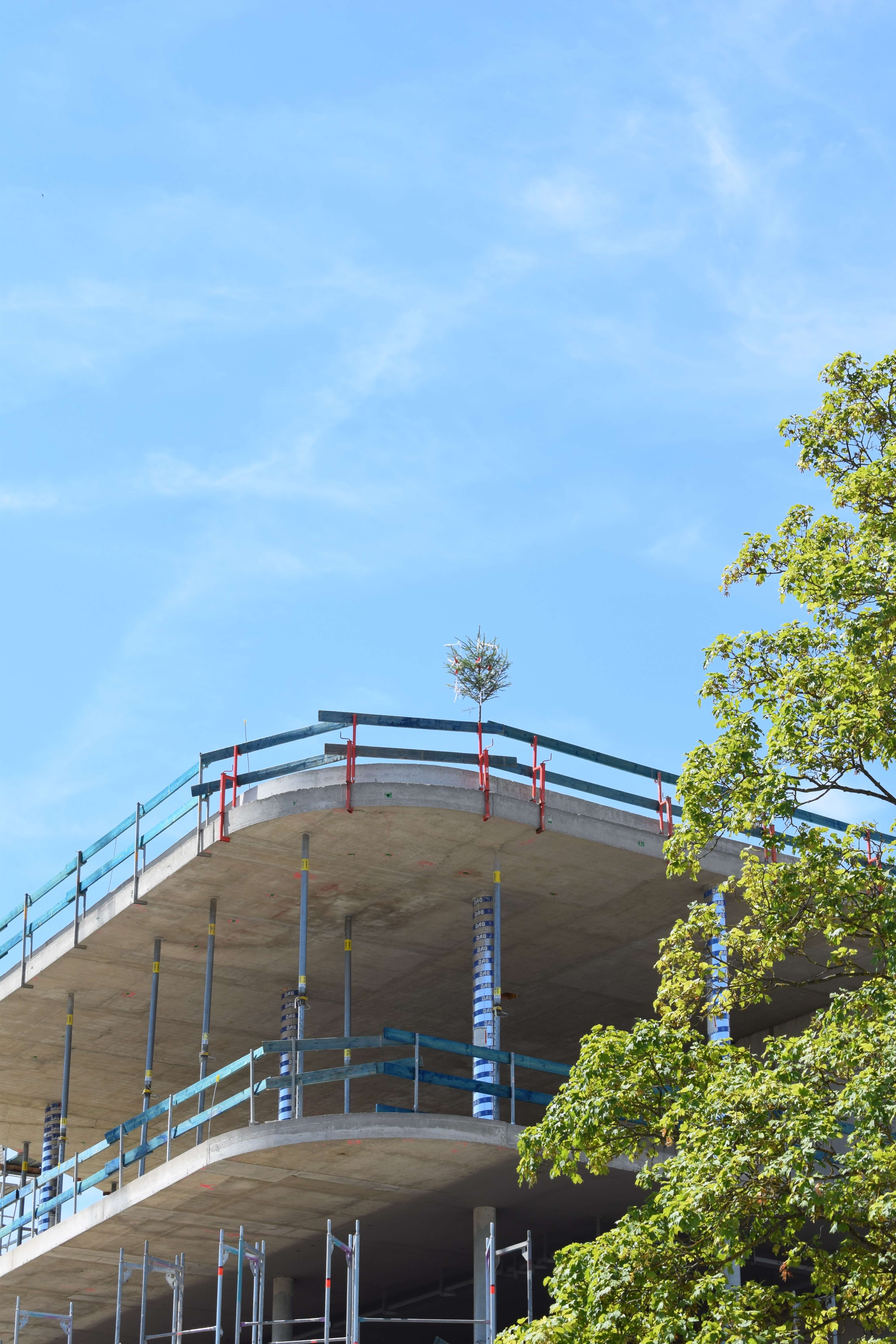 Das Fassadengerüst steht vollständig und auch die später sichtbaren Decken in den Bürobereichen sind bereits gestrichen. Die freitragende Faltwerktreppe wird im weiteren Verlauf mit Stahlblechgeländern ausgestattet. Der Rohbauer hat fast sein Werk getan und die Baustelle wird gerade von ihm beräumt, damit die Folgegewerke starten können.