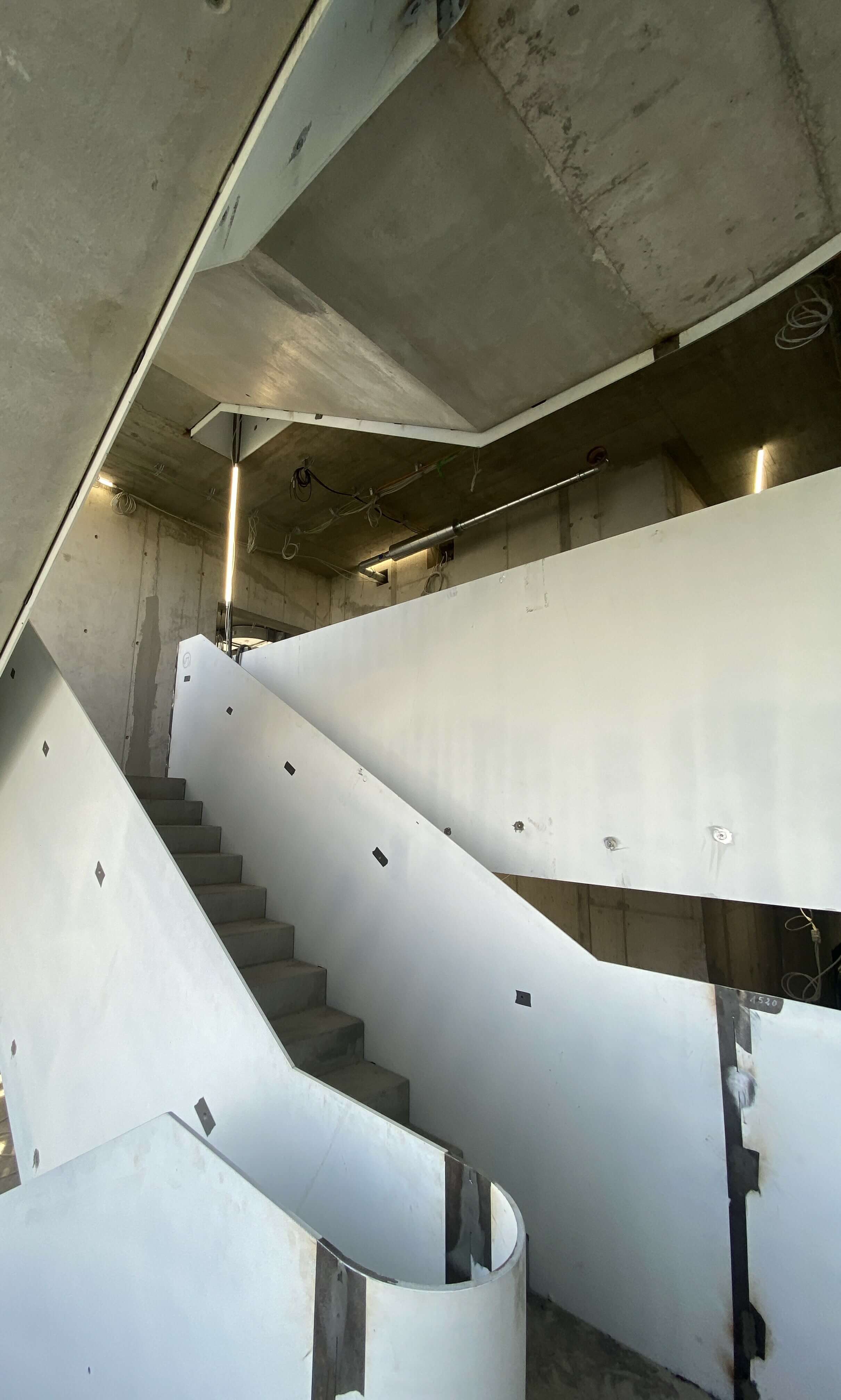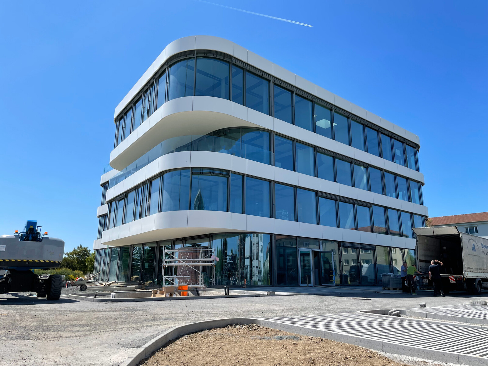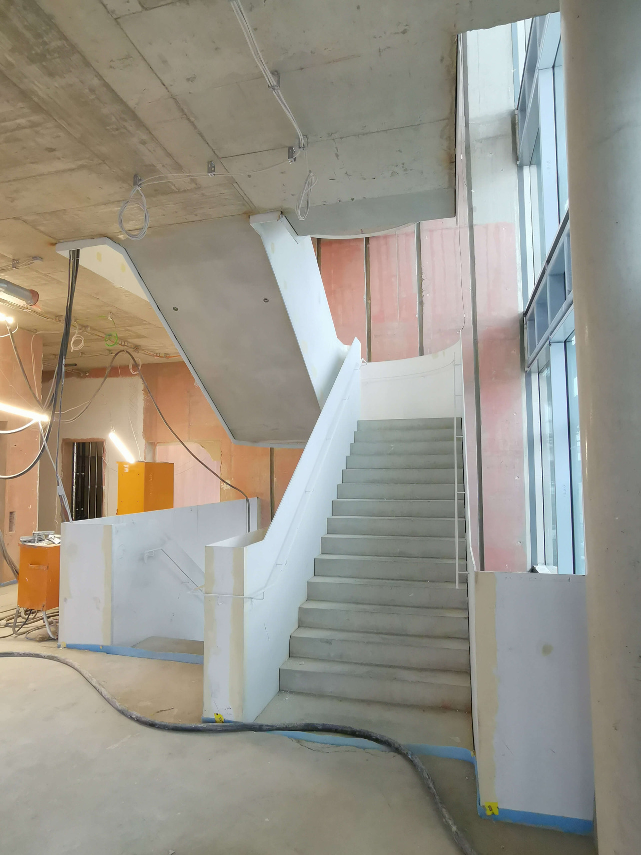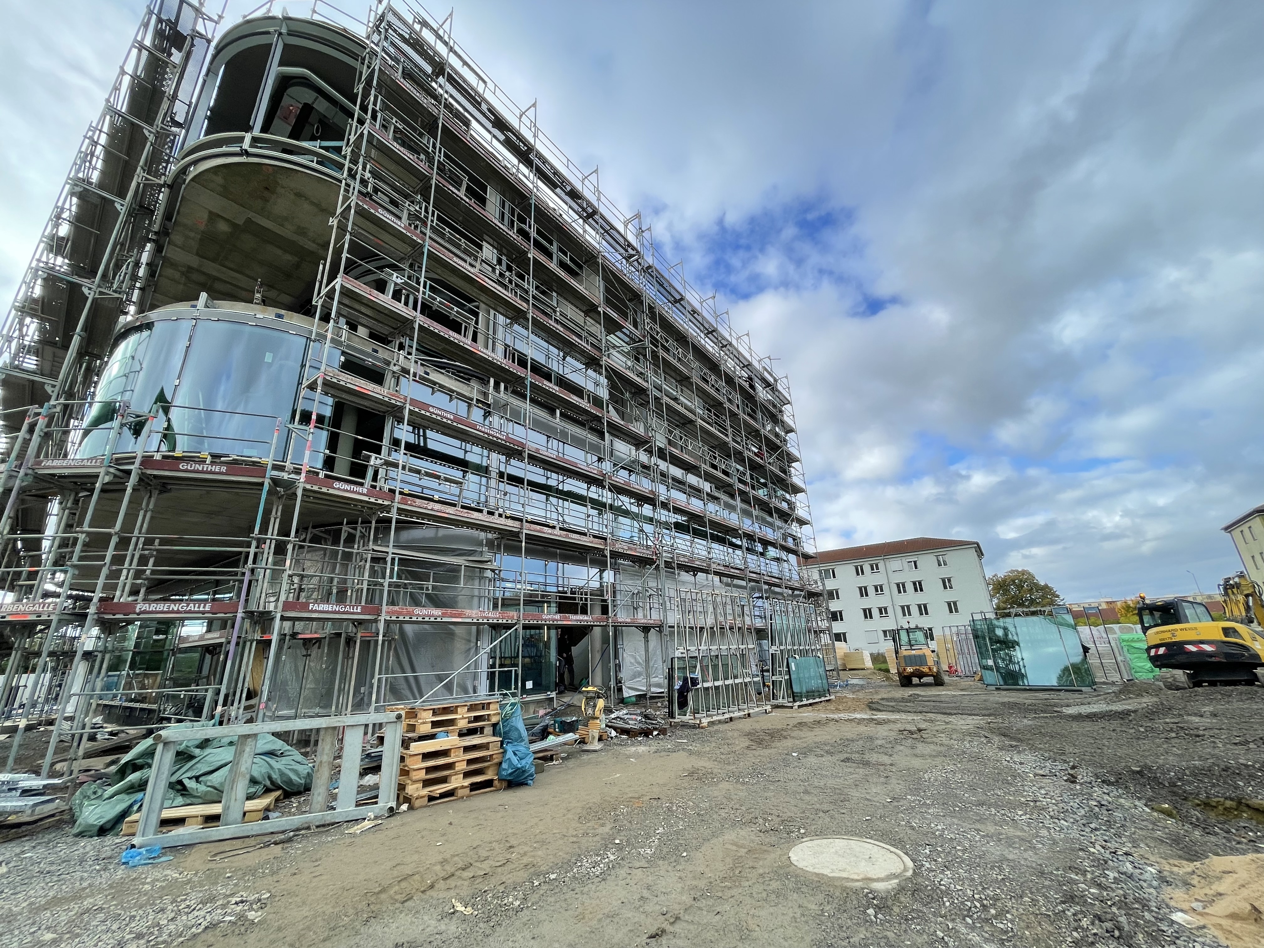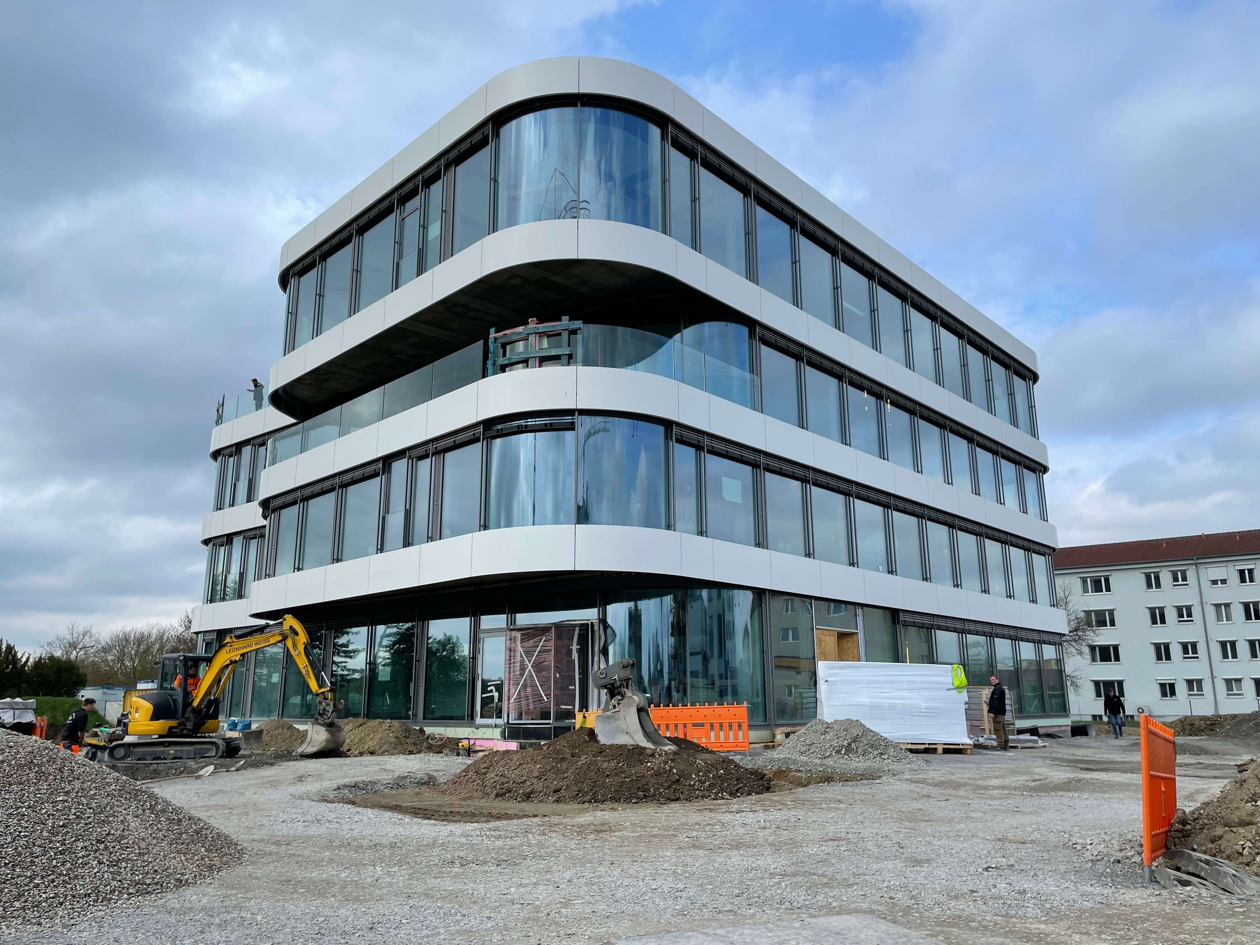 Das Fassadengerüst steht vollständig und auch die später sichtbaren Decken in den Bürobereichen sind bereits gestrichen. Die freitragende Faltwerktreppe wird im weiteren Verlauf mit Stahlblechgeländern ausgestattet. Der Rohbauer hat fast sein Werk getan und die Baustelle wird gerade von ihm beräumt, damit die Folgegewerke starten können.
