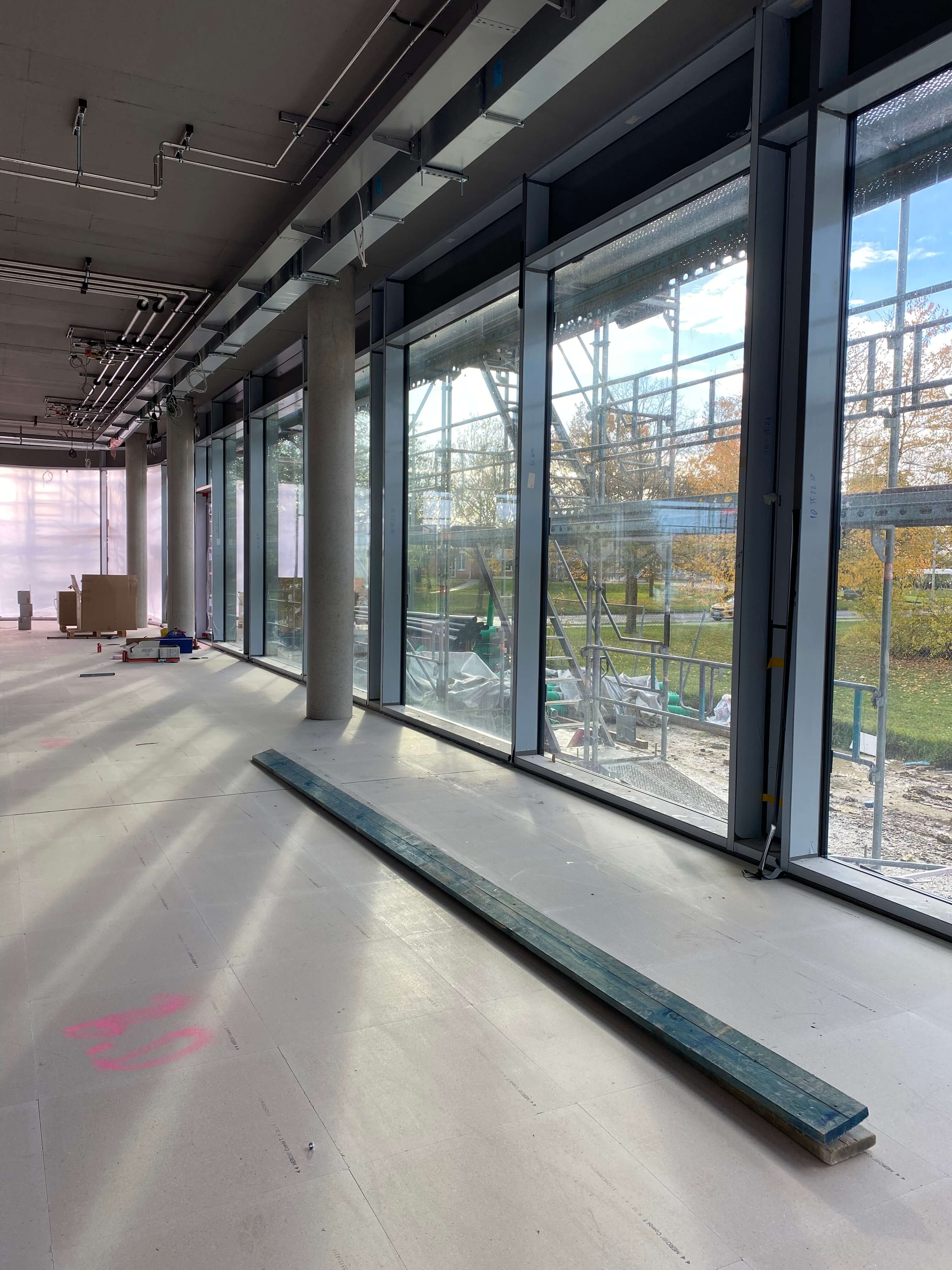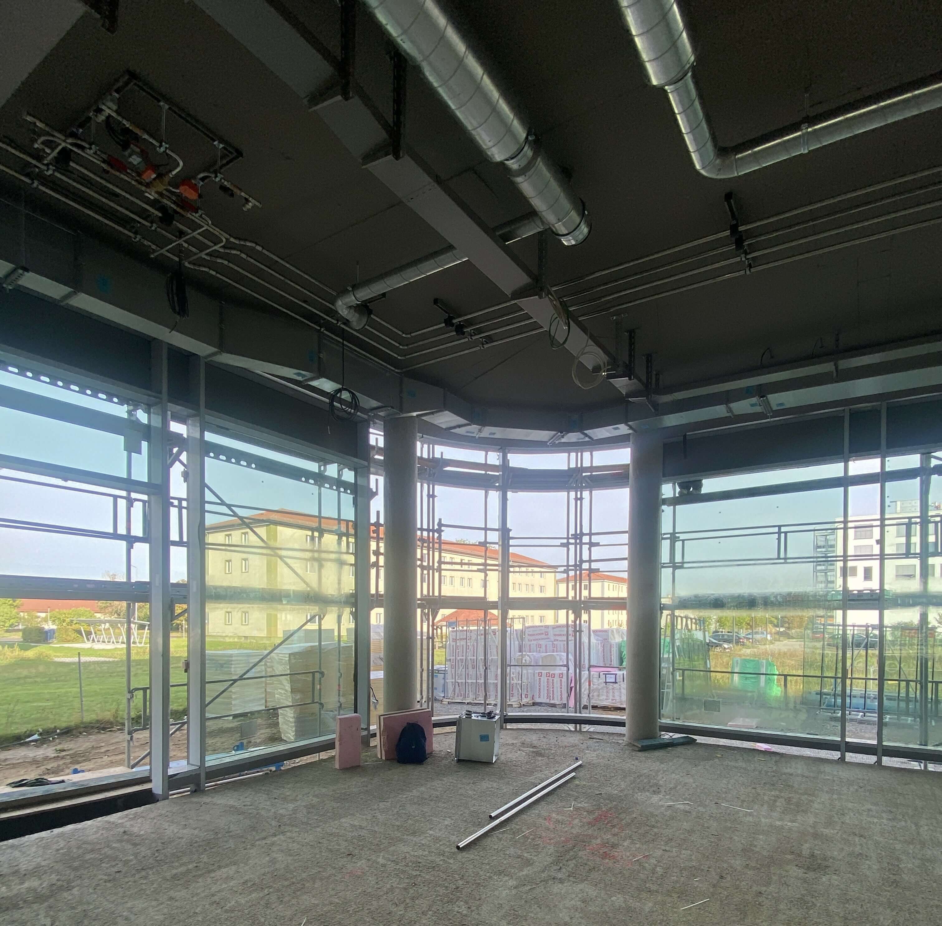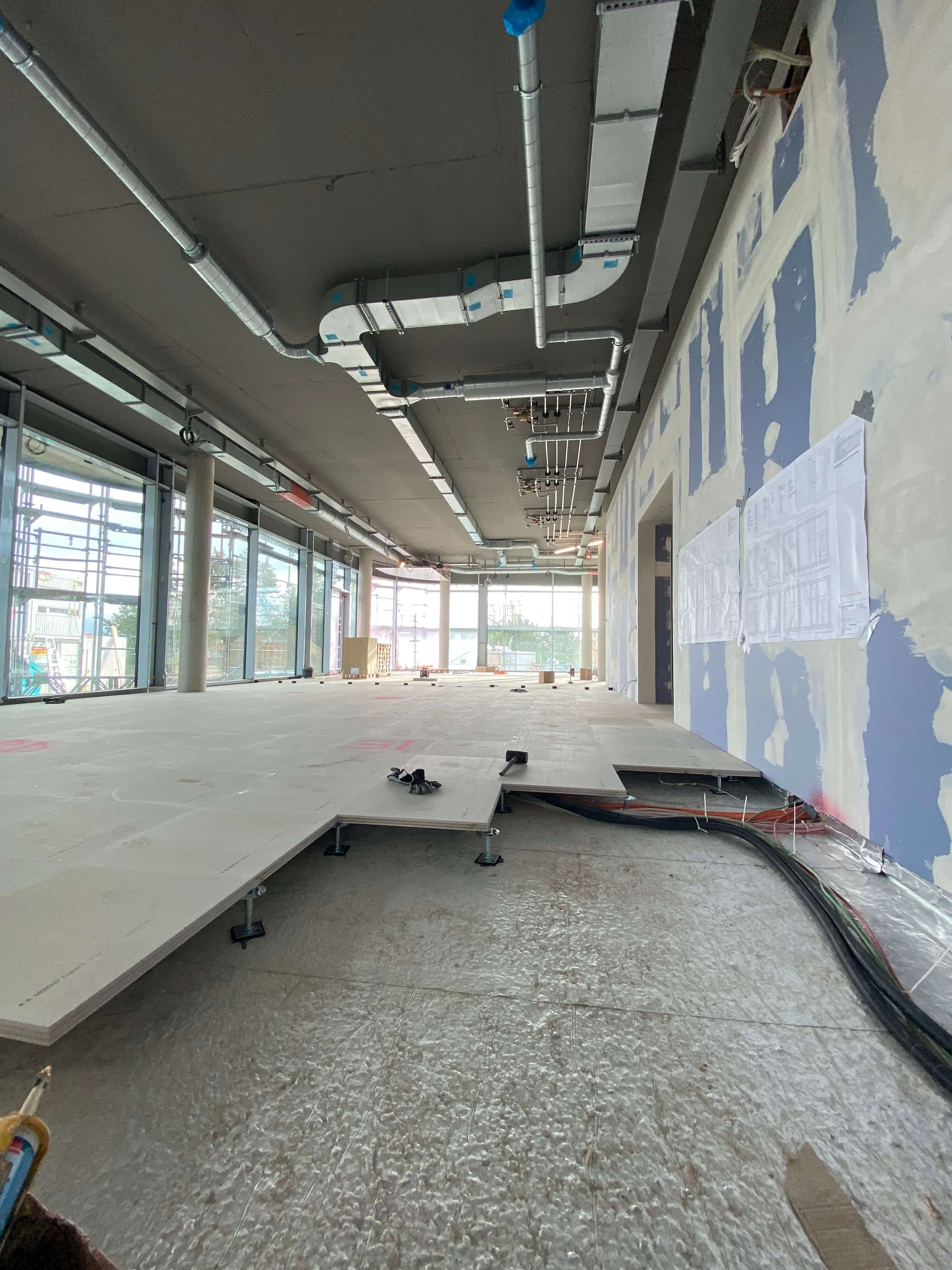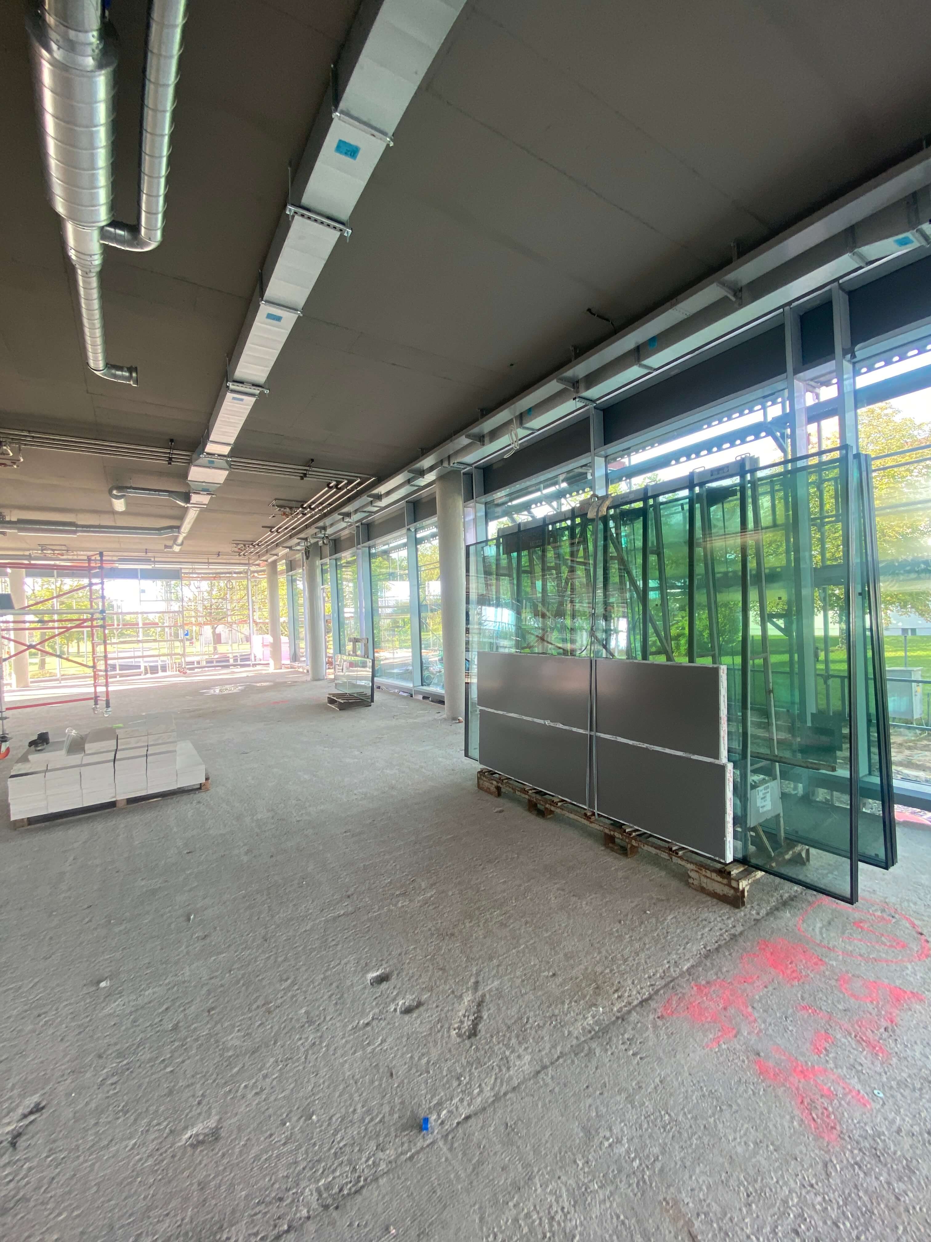 Und das Gebäude nimmt deutlich Gestalt an: die Fassade ist komplett verglast. Innen sind bereits viele Räume mit Doppelböden versehen. In den restlichen Abschnitten sind die Spiralen der Fußbodenheizung montiert – aktuell wird der Estrich darüber gegossen.