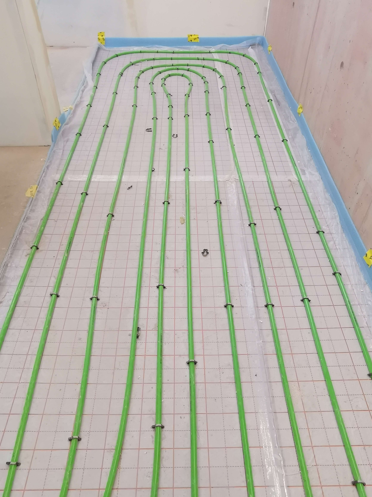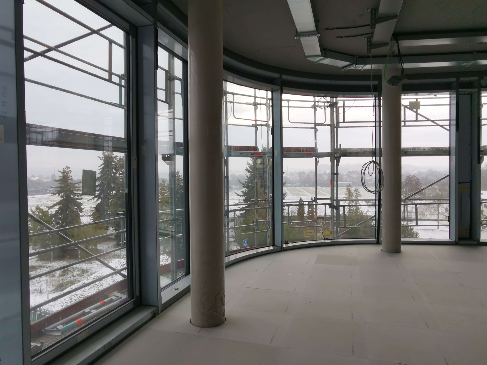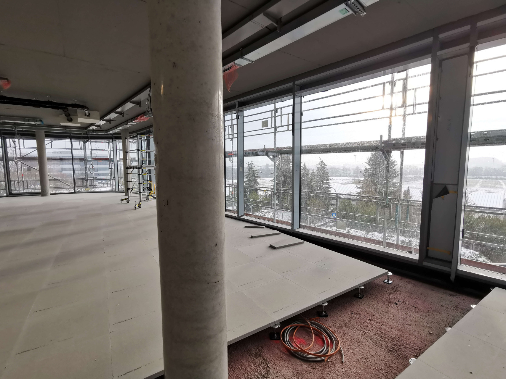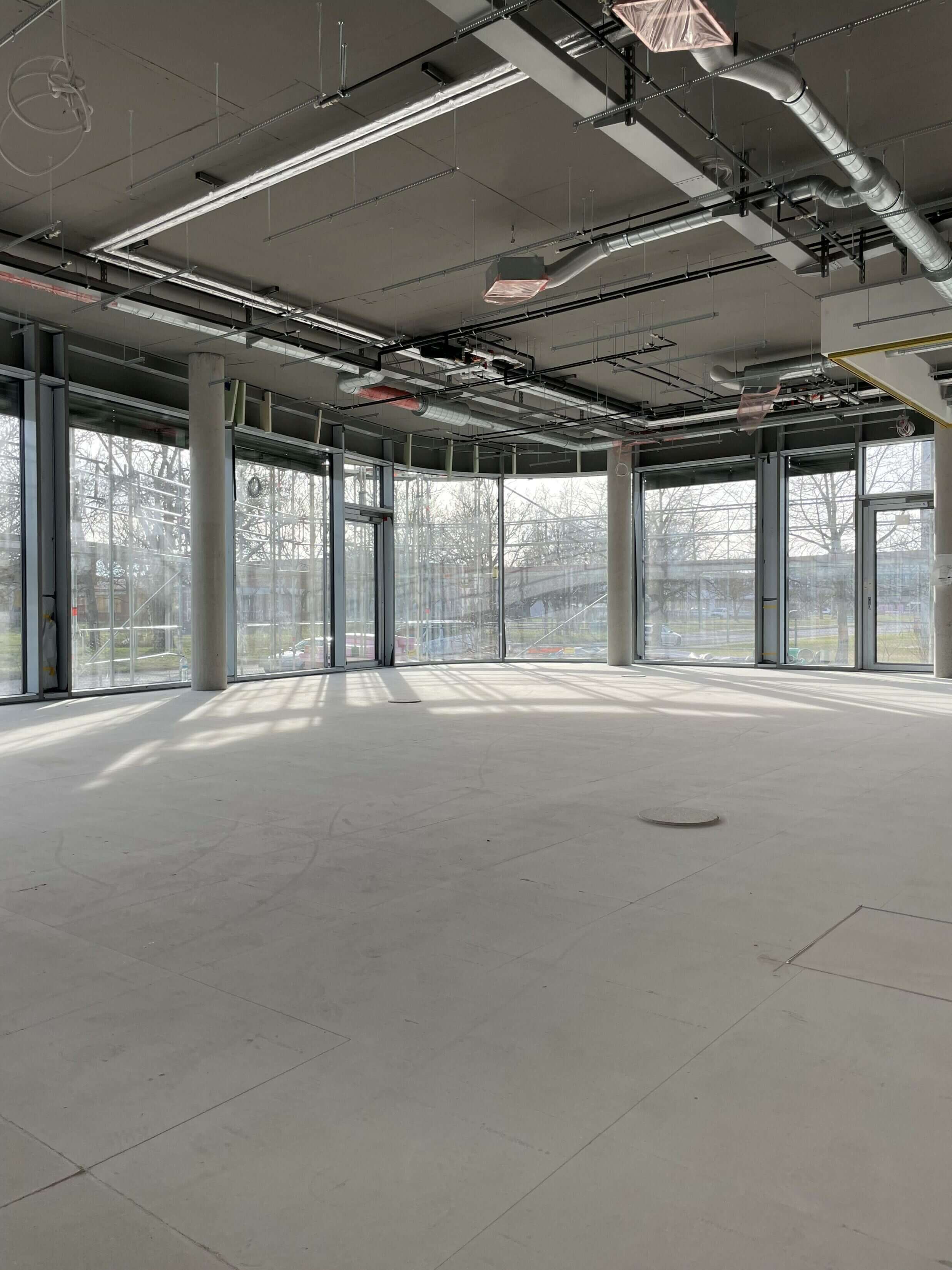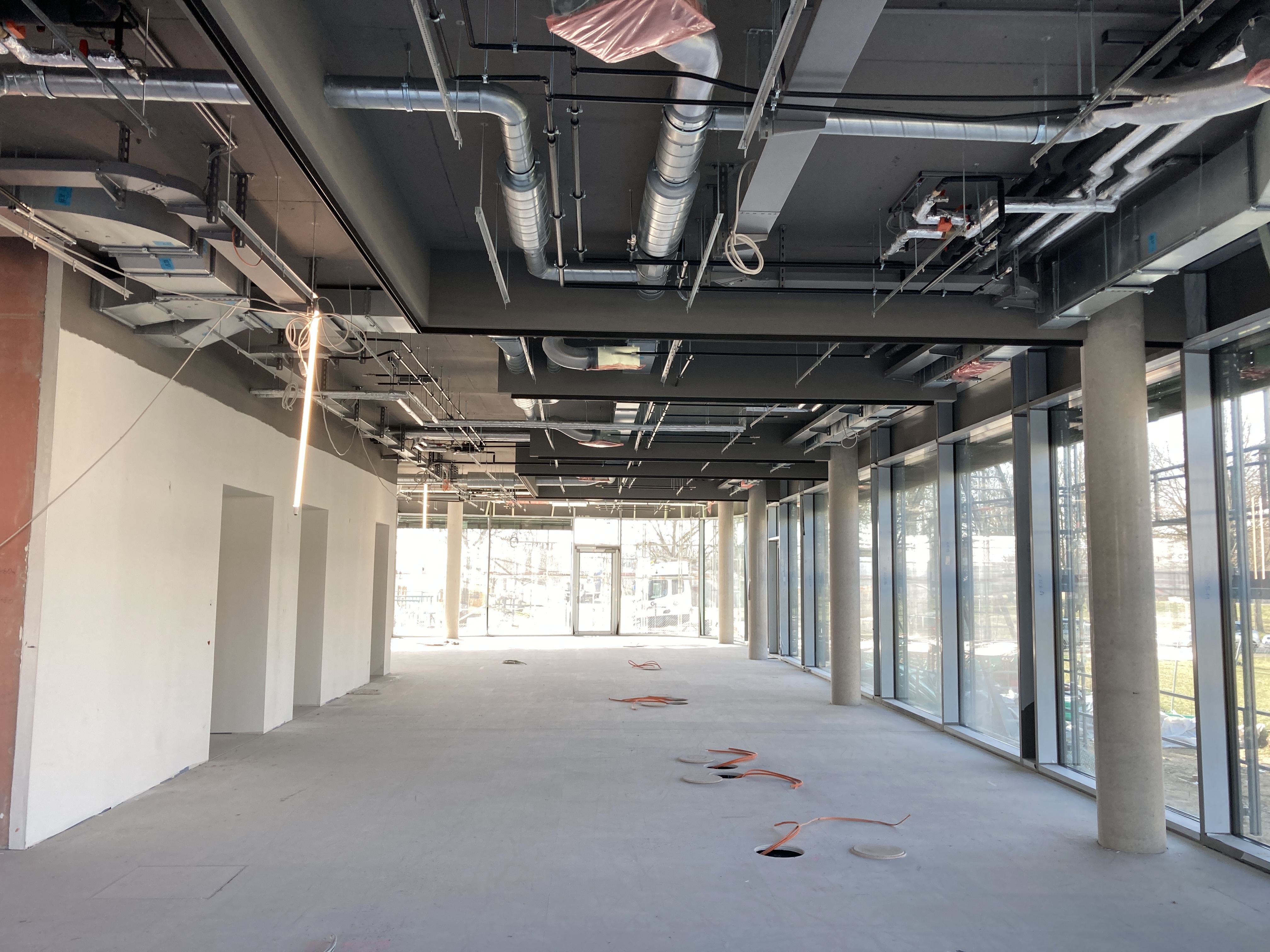 Und das Gebäude nimmt deutlich Gestalt an: die Fassade ist komplett verglast. Innen sind bereits viele Räume mit Doppelböden versehen. In den restlichen Abschnitten sind die Spiralen der Fußbodenheizung montiert – aktuell wird der Estrich darüber gegossen.