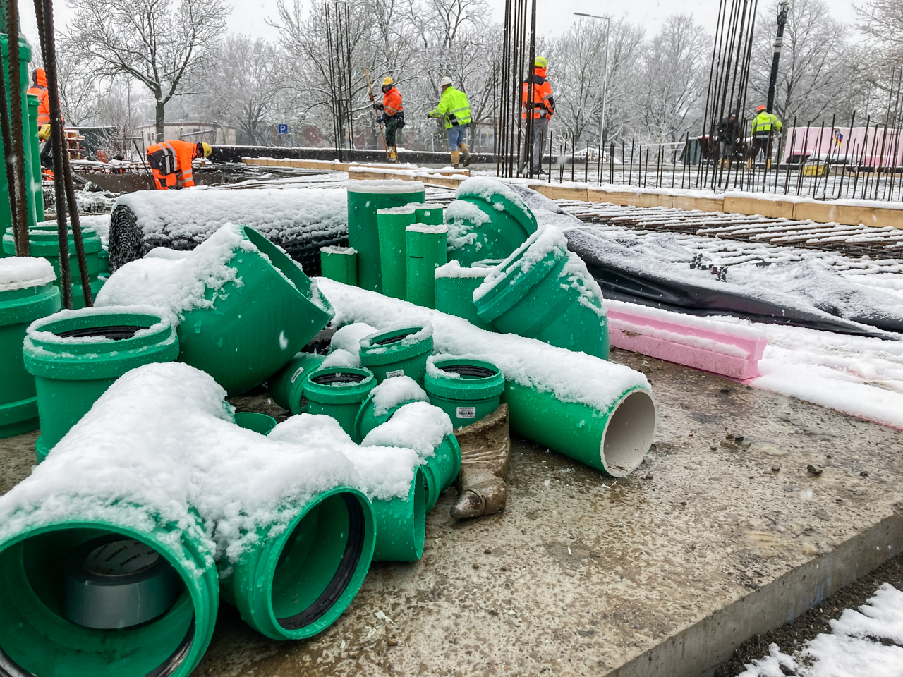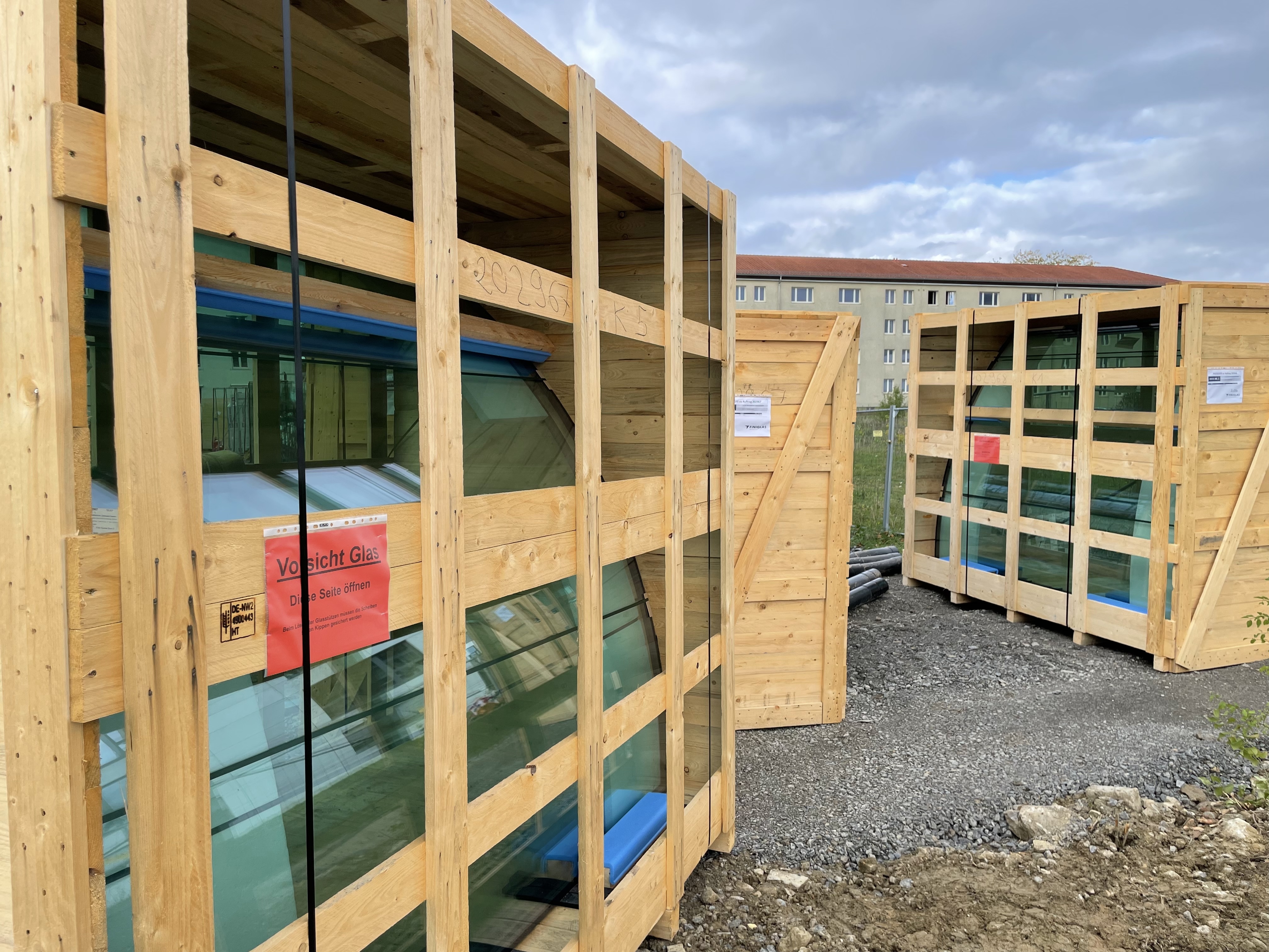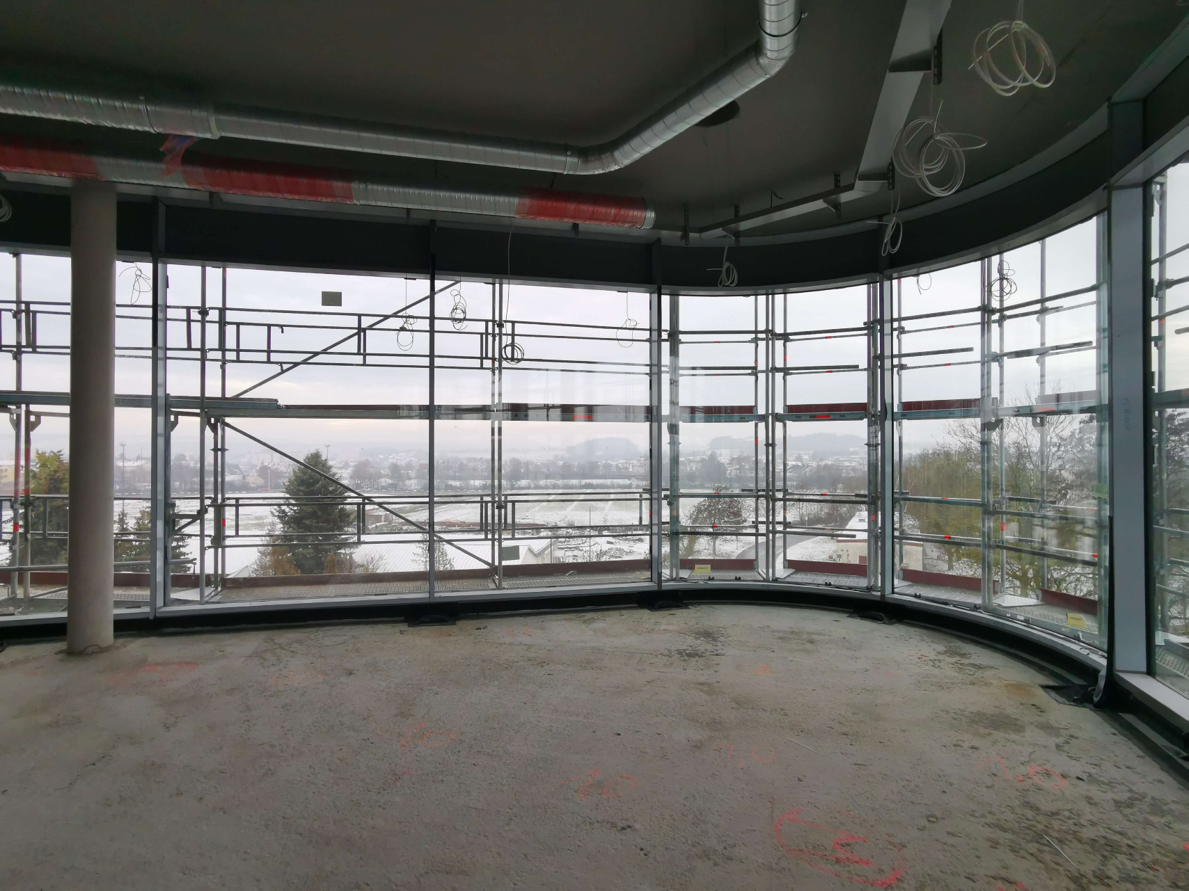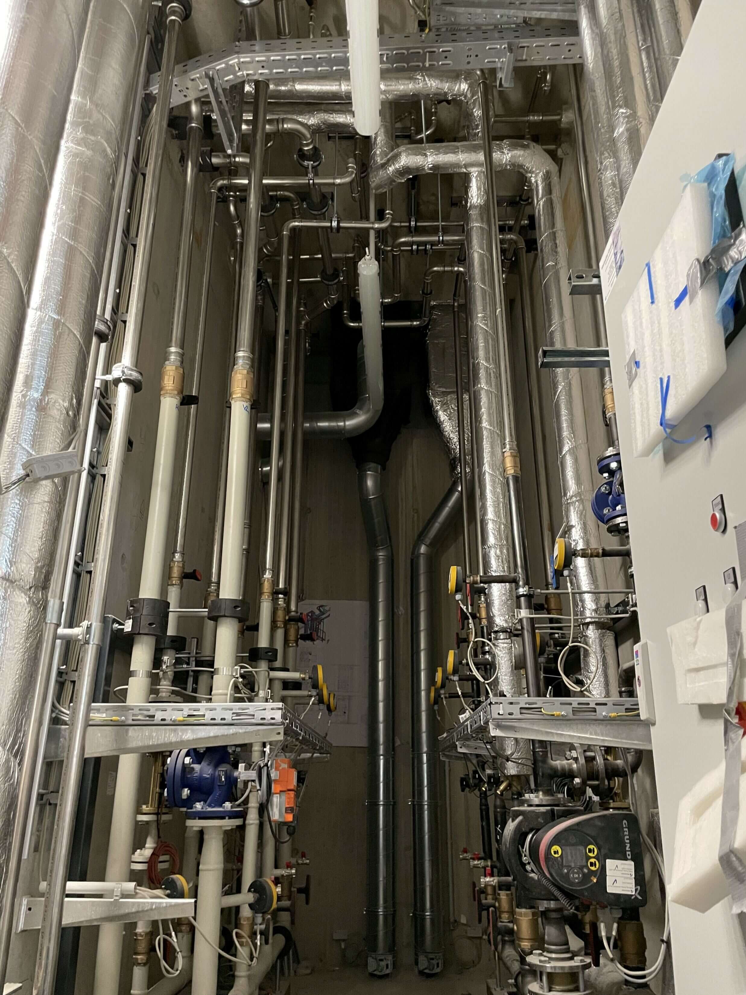Und das Gebäude nimmt deutlich Gestalt an: die Fassade ist komplett verglast. Innen sind bereits viele Räume mit Doppelböden versehen. In den restlichen Abschnitten sind die Spiralen der Fußbodenheizung montiert – aktuell wird der Estrich darüber gegossen.