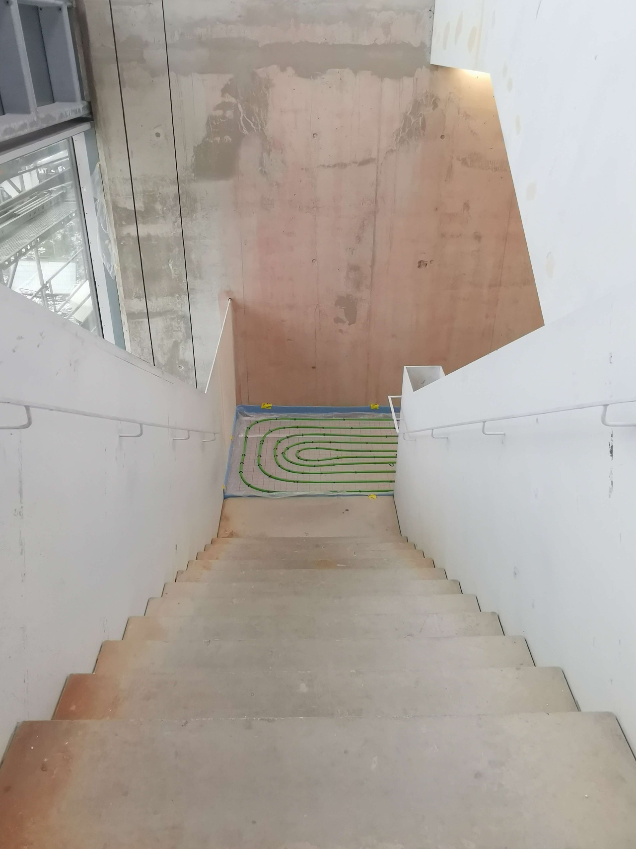 Der Schlosser hat das Stahlblechgeländer montiert, verschraubt, verschweißt und glattgeschliffen - ein Glattblech des Treppengeländers entsteht. Die technische Gebäudeausstattung auf der Bürofläche wird montiert. Die Glasböcke stehen an Ort und Stelle bereit und warten auf ihren Einbau.