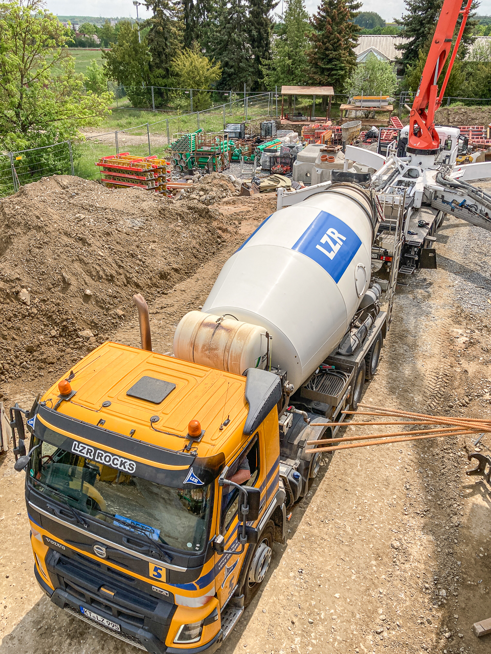 Der Rohbau des Erdgeschosses steht! Die Betonpumpen sind in den letzten Tagen mit Hochdruck gelaufen, um die Decke des Erdgeschosses zu gießen und glattzuziehen. Das erste Stockwerk ist fast fertig und die Vorbereitungen für das zweite können beginnen.