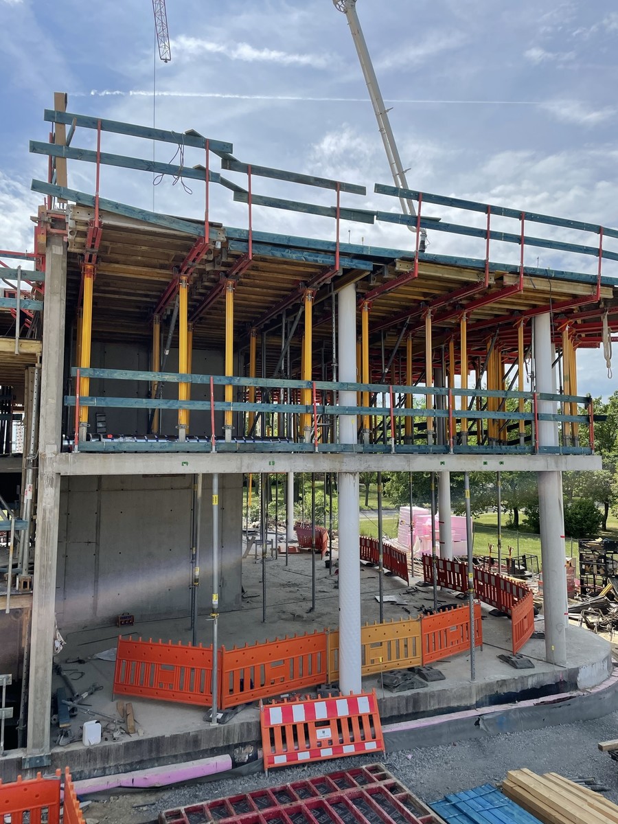 Nun steht das zweite Stockwerk. Die moderne Geometrie des Gebäudes ist nun immer besser zu erkennen. Bald wird die Decke des zweiten Geschosses gegossen.