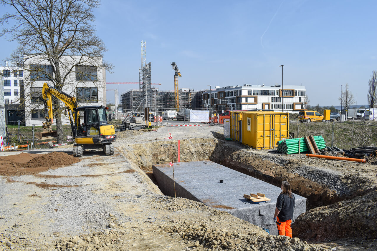 Auch das Rückhaltebecken ist eingebettet, um später das anfallende Regenwasser in die Kanalisation zu leiten.